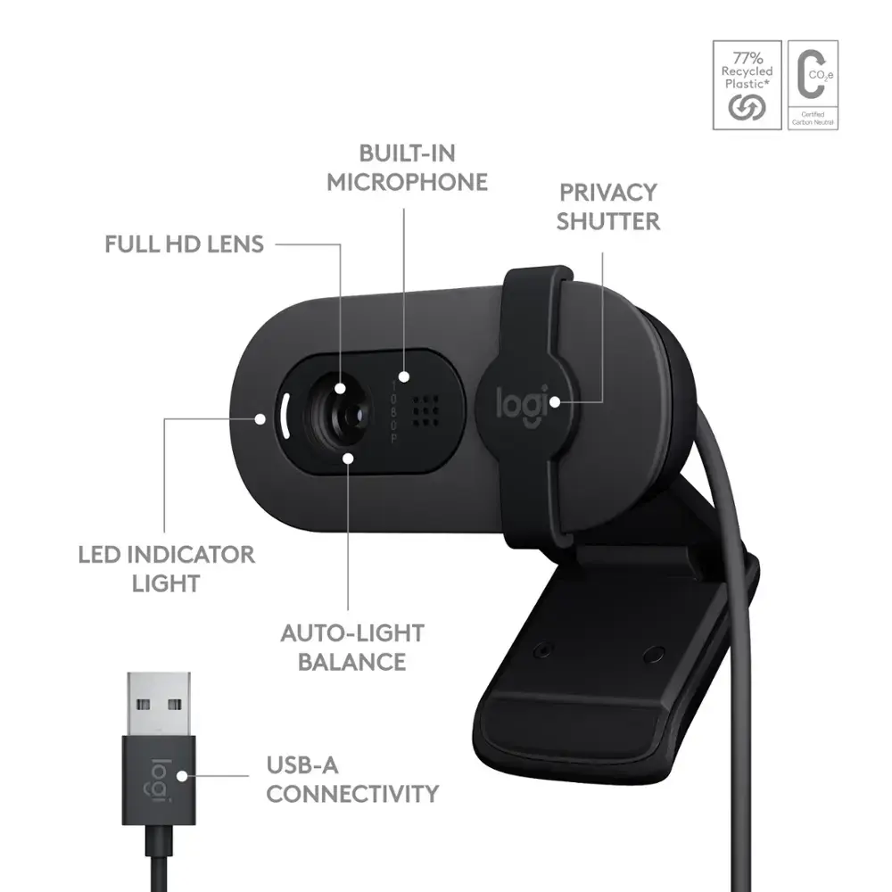 Enhance your video calls with the Brio 100—a budget-friendly webcam designed to help you look, sound, and present yourself at your best. Enjoy crisp Full HD 1080p resolution and automatic light correction for improved brightness and clarity. A built-in microphone ensures clear audio, while an integrated privacy shutter offers complete control over your visibility.