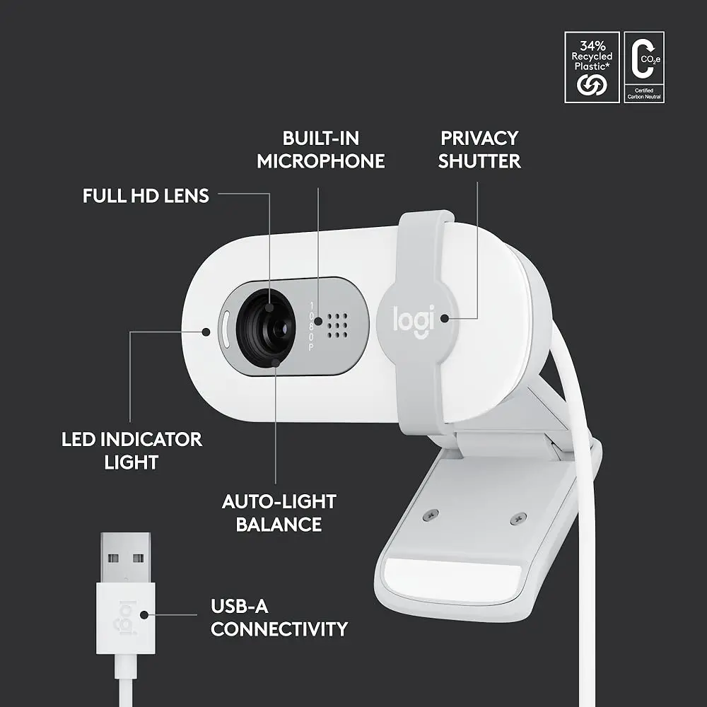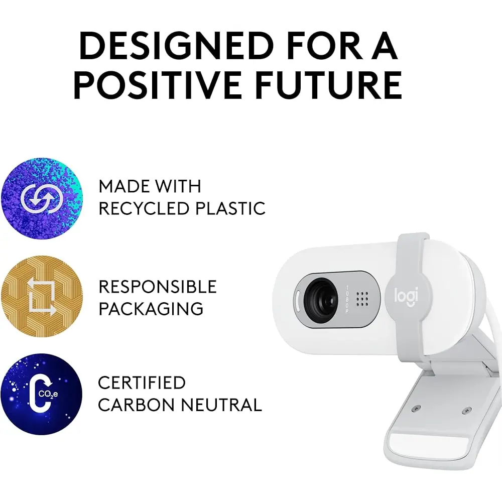 Experience enhanced video calls with Full HD 1080p resolution, delivering sharper image quality for a more professional appearance. RightLight technology increases brightness by up to 50% and minimizes shadows, helping you look your best compared to earlier Logitech webcams. The integrated privacy shutter offers peace of mind with an easy slide when the camera is not in use. Enjoy clear audio with the built-in microphone, and seamless compatibility with popular platforms like Microsoft Teams, Google Meet, and Zoom. Vibrant color options add a touch of personality to your workspace, while the eco-friendly design incorporates at least 34% post-consumer recycled plastic for a more sustainable choice.