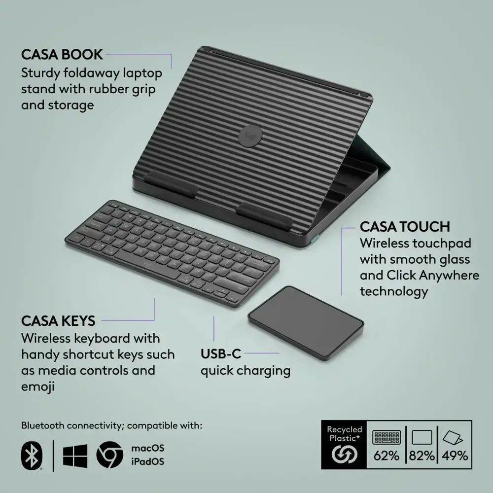 The Logitech Casa Pop-Up Desk Work From Home Kit offers a sleek and efficient solution for remote work with its compact wireless keyboard, providing a comfortable typing experience while saving desk space. The integrated touchpad ensures smooth navigation, eliminating the need for an external mouse. This kit includes an adjustable laptop stand designed for laptops and MacBooks ranging from 10” to 17”, enhancing ergonomics and comfort. With its classic chic design, it adds a stylish touch to any workspace, and its wireless connectivity offers a clutter-free setup, making it ideal for both home and on-the-go use