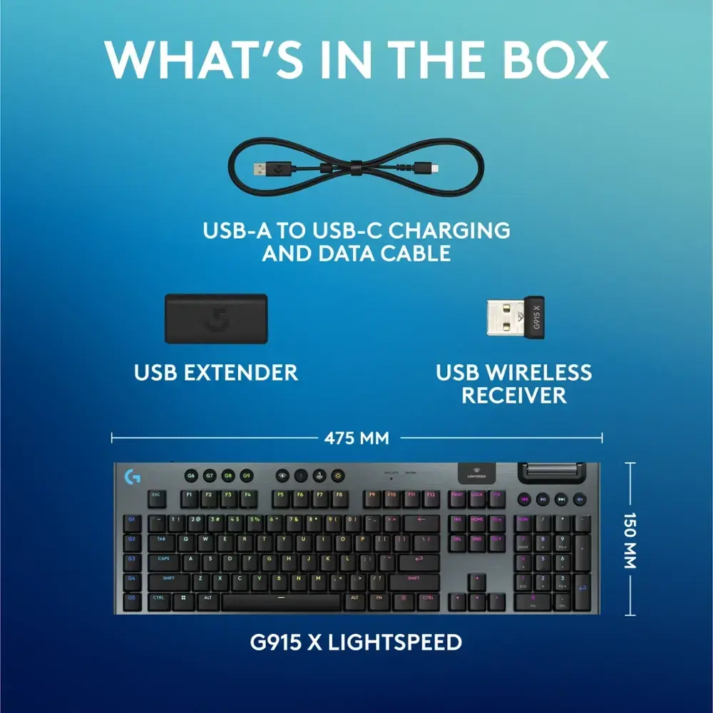 The Logitech G915 X LIGHTSPEED Wireless Mechanical Gaming Keyboard features a full-size layout, providing a complete and comfortable gaming and typing experience. It is equipped with GL Blue Clicky Switches, offering tactile feedback and an audible click sound for an enhanced typing feel. With LIGHTSPEED Wireless technology, it ensures fast, lag-free connectivity for an uninterrupted gaming session. The RGB Backlighting allows for customizable lighting effects, adding a personalized touch to your setup. Compatible with both PC and Mac, this sleek keyboard comes in a stylish Black design, making it perfect for any gaming or professional environment