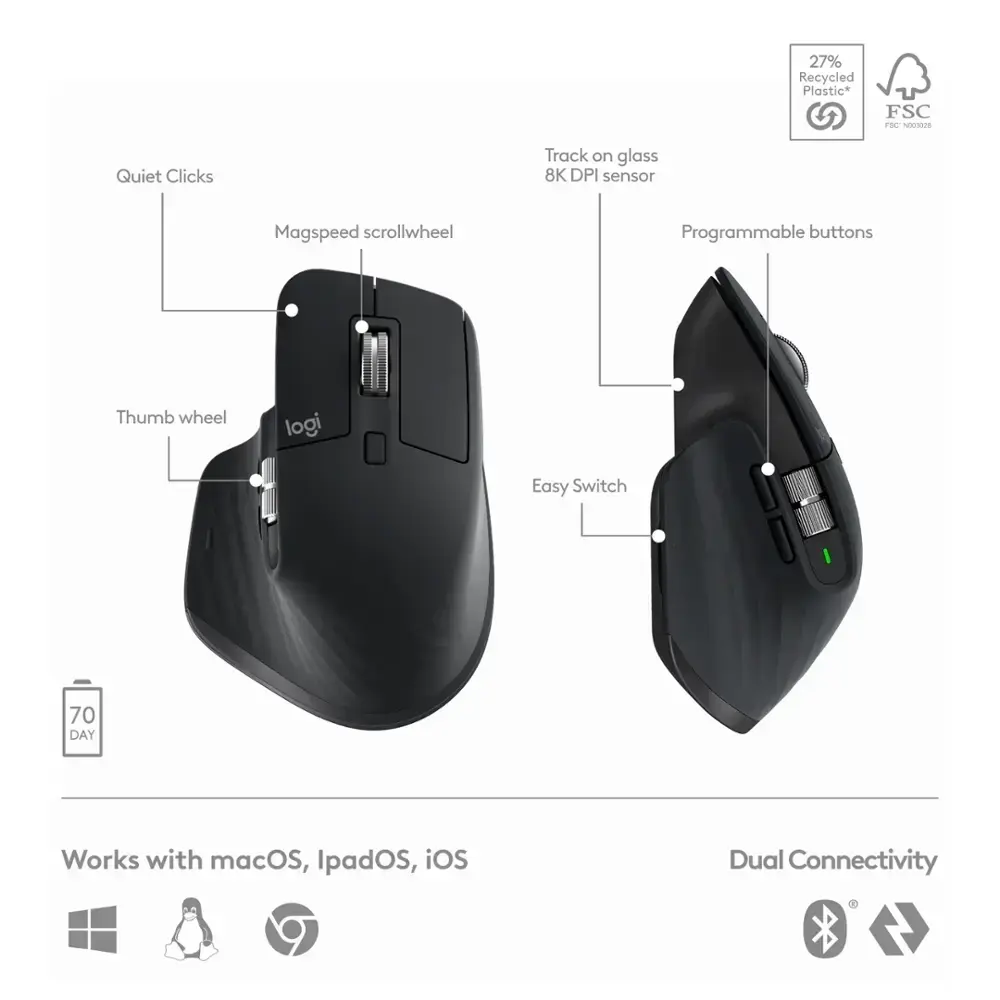 - Multi-Device & Multi-OS Support: Seamlessly switch between up to 3 devices (Windows, macOS, Linux) via Bluetooth or Logi Bolt USB receiver.