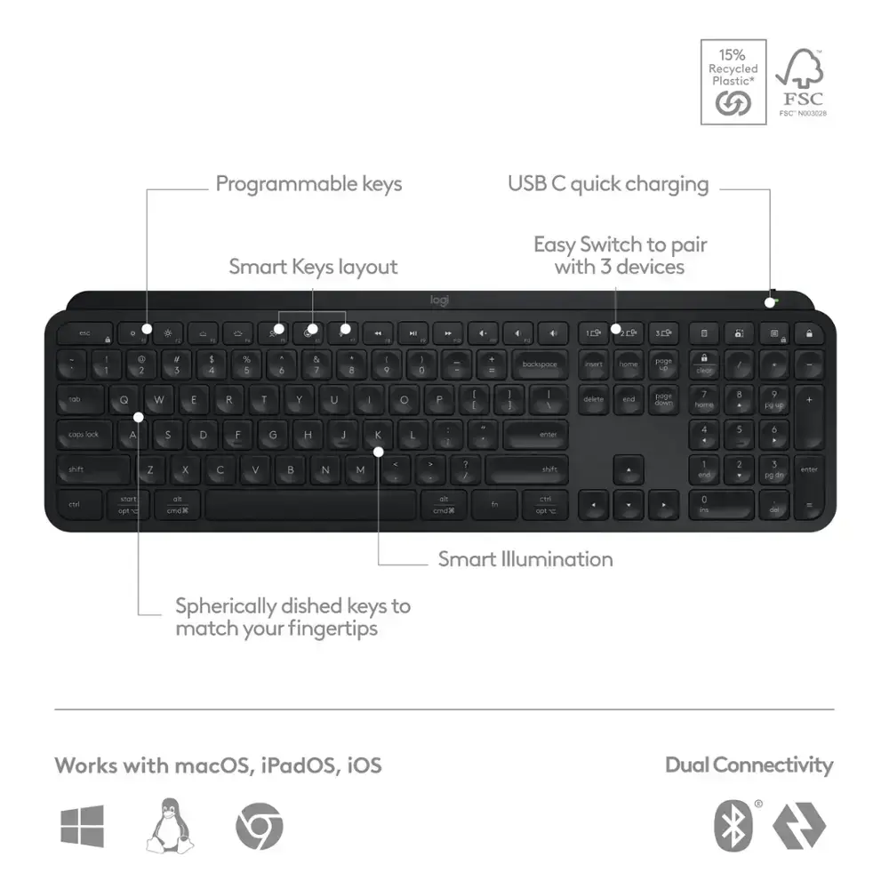 - Environmentally Friendly Design: The MX Keys S is made using certified post-consumer recycled plastic, contributing to sustainability. The black version contains 15% recycled plastic, while the pale grey version contains 11% recycled plastic.