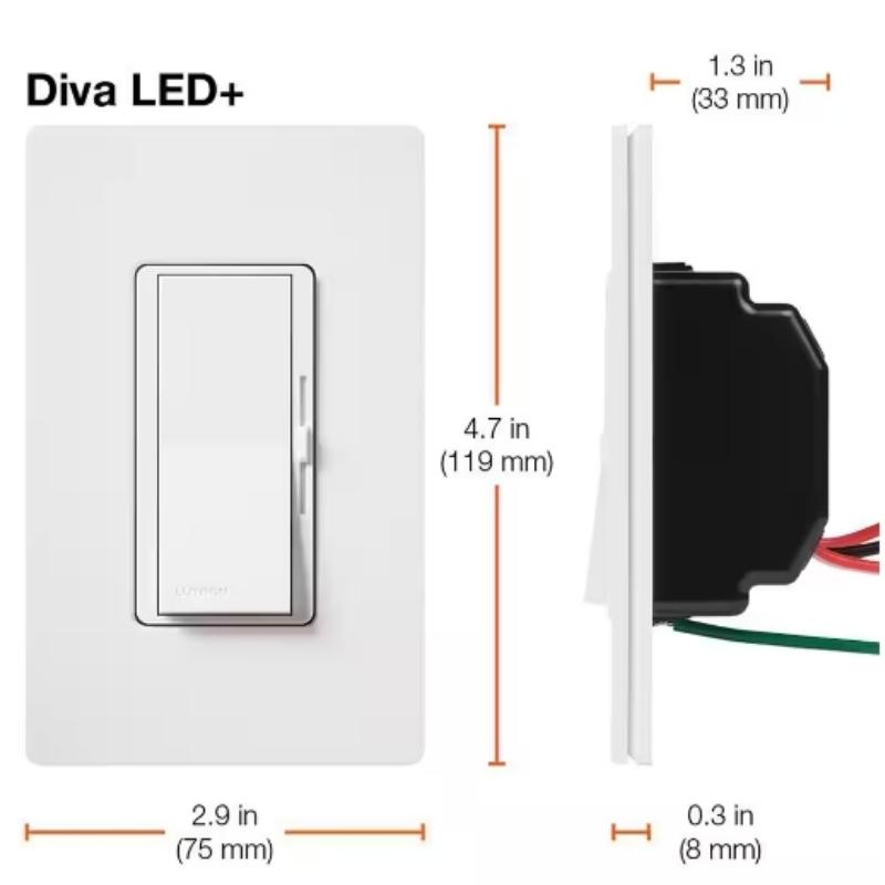 The Lutron Diva LED+ Dimmer Switch for Dimmable LED Bulbs, 150-Watt/Single-Pole or 3-Way, White (DVCL-153P-WH-2) is designed for smooth and reliable dimming of LED and incandescent bulbs. This dimmer switch supports up to 150 watts of dimmable LED or 600 watts of incandescent lighting, and can be used in single-pole or 3-way configurations. The sleek white finish integrates seamlessly with various home decors. The 2-pack provides value and convenience, suitable for upgrading multiple switches in a home. Details: Amperage (A):1.25 A Color Family:White Commercial/Residential:Residential Compatible Bulb Type:CFL, Halogen, Incandescent, LED Device Style Type:Dimmer w/o Wall Plate Dimmable Capability:Dimmable Dimmer Type:Rocker Finish Type:Gloss Function Type:3-Way, Single Pole Included:No Additional Items Included Indoor/Outdoor:Indoor Material:Resin Maximum Amperage (A):1.25 A Mounting Type:In-Wall Number of Poles:1 Number of Switches:Two Package Quantity:2 Switch Depth (in.):1.31 in Switch Height (in.):4.69 in Switch Style:Rocker Switch Width (in.):2.93 in Voltage:120 volt Voltage (V):120 V Wall Plate Configuration:Decorator/Rocker Wattage (W):150 W