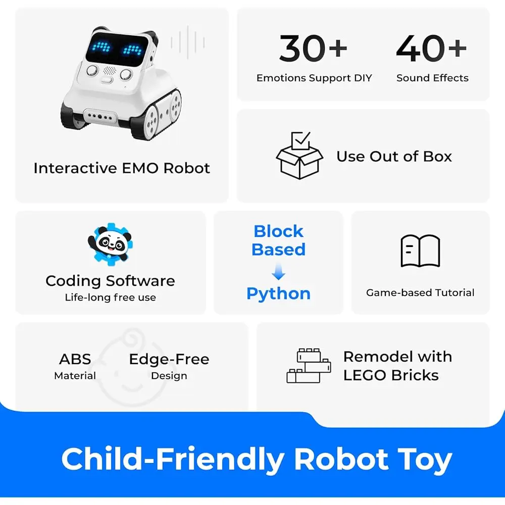 - Interactive Emo Robot: With its adorable panda design, vibrant sound effects, and expressive facial animations (smiling, anger), Codey Rocky helps cultivate emotional development while keeping kids entertained.