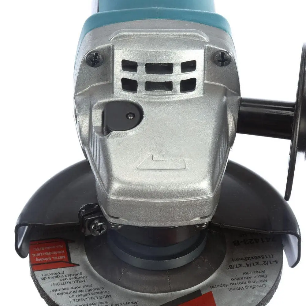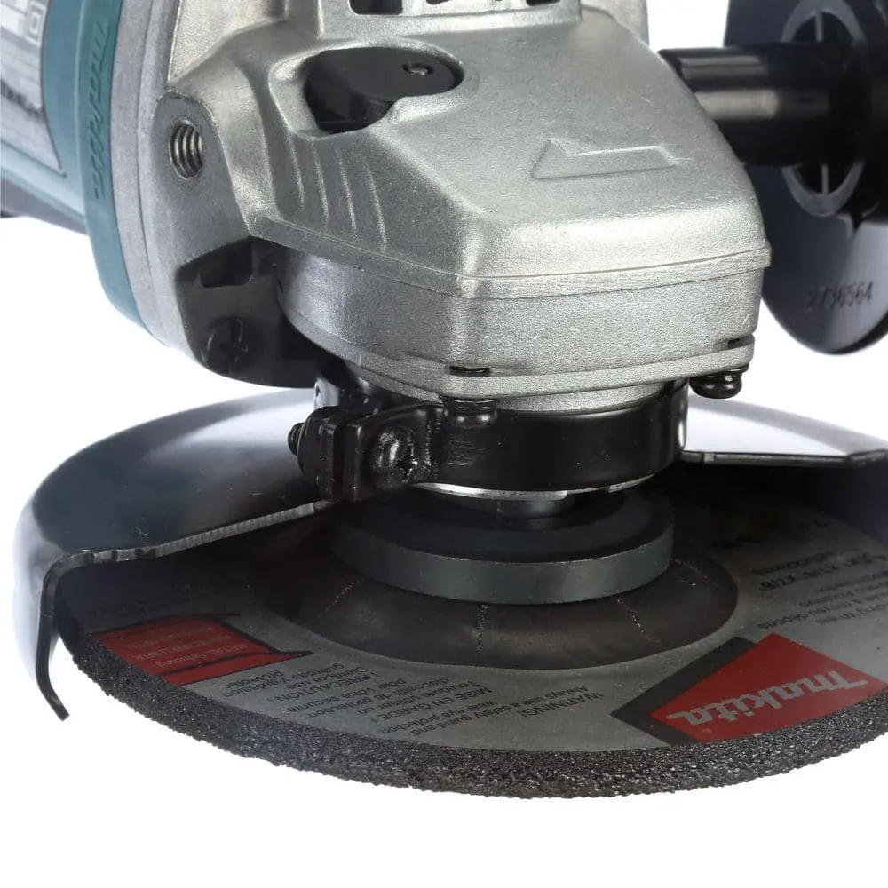 The Makita 4-1/2" Angle Grinder is designed for industrial performance, combining 7.5 AMP power with comfort and durability features for extended tool life. This 9557PB model delivers an impressive 11,000 RPM, making it suitable for cutting, grinding, and polishing applications. It incorporates labyrinth construction to protect the motor and bearings from dust and debris, enhancing tool longevity. A protective zig-zag varnish shields the armature from contaminants, and an extra-large paddle switch ensures easy operation. Weighing just 4.5 lbs., the grinder includes a side handle that can be positioned on either side and features an AC/DC switch for alternative power sources.
