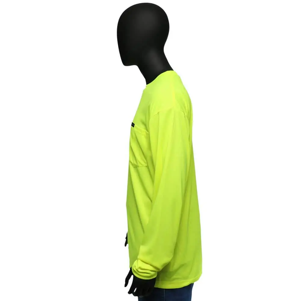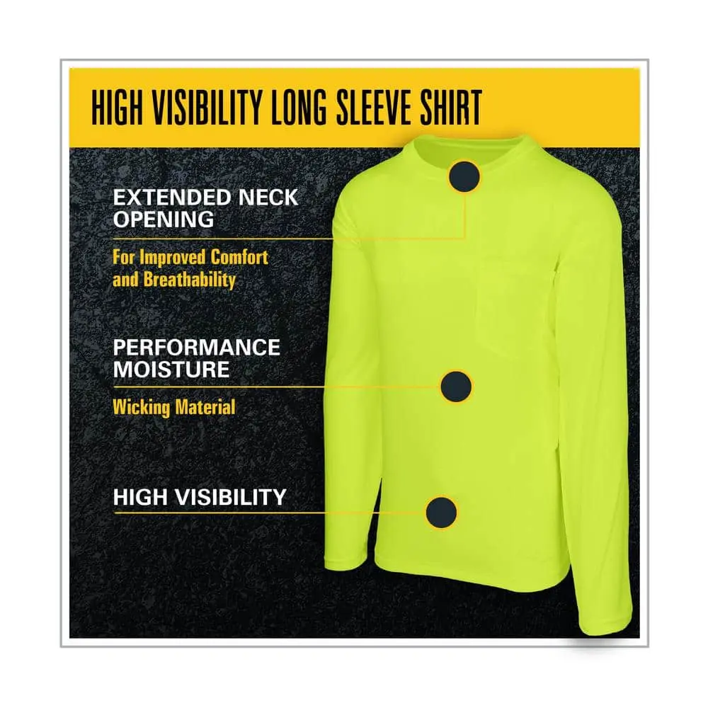 Stay visible and comfortable with this high-visibility long-sleeve shirt. Featuring long sleeves for improved visibility, this shirt is made from performance-wicking material to keep you cool during work. The wider neck opening enhances comfort and breathability, while the exterior chest pocket provides convenient storage for small items. This shirt is perfect for work areas that require high-visibility but do not mandate ANSI protection.