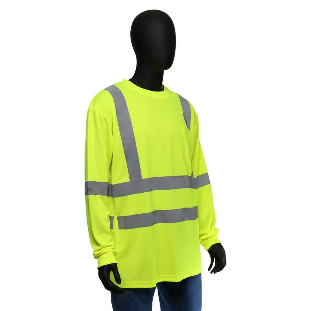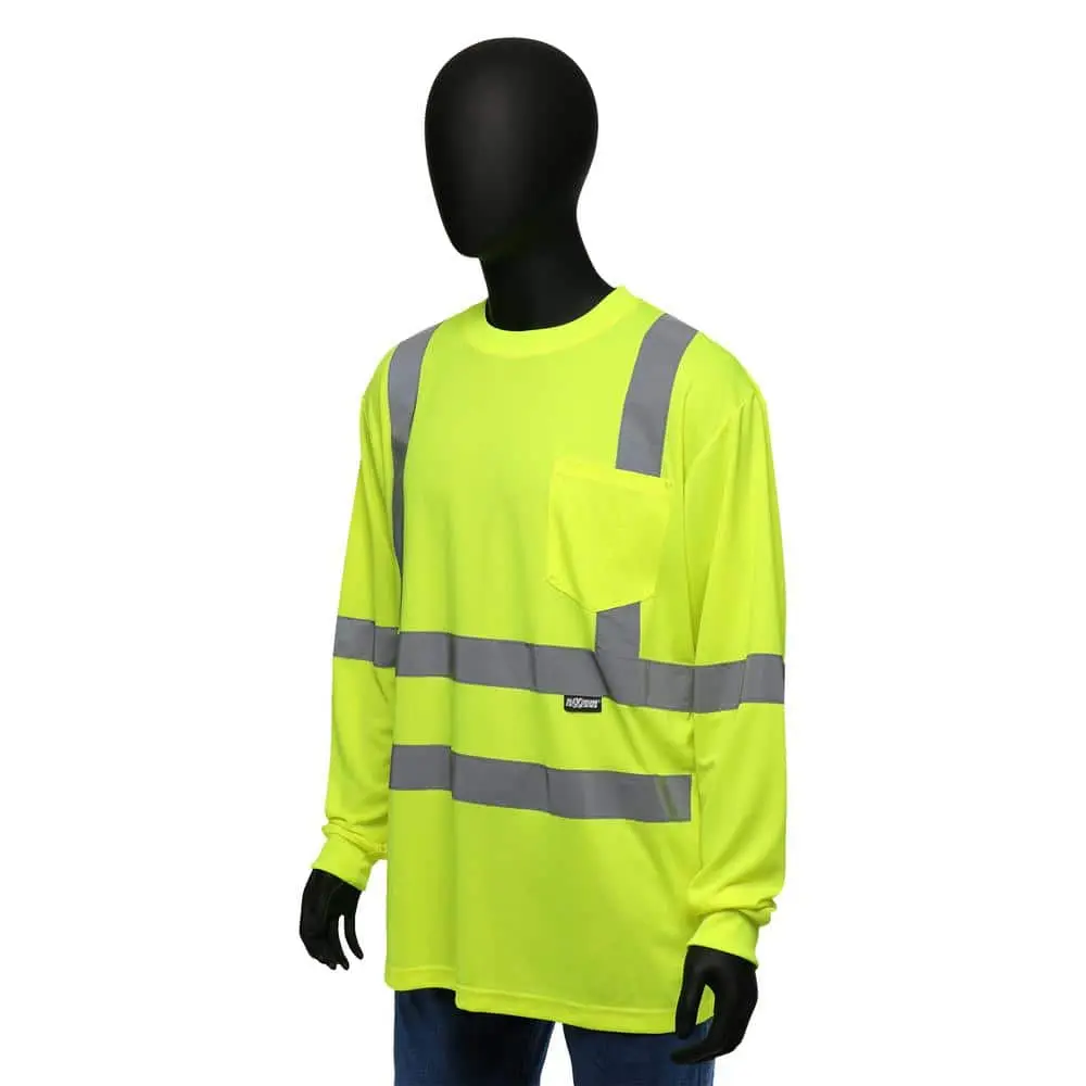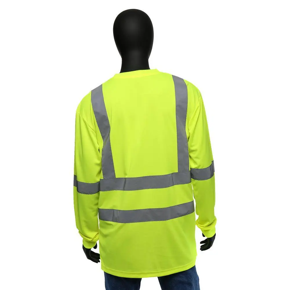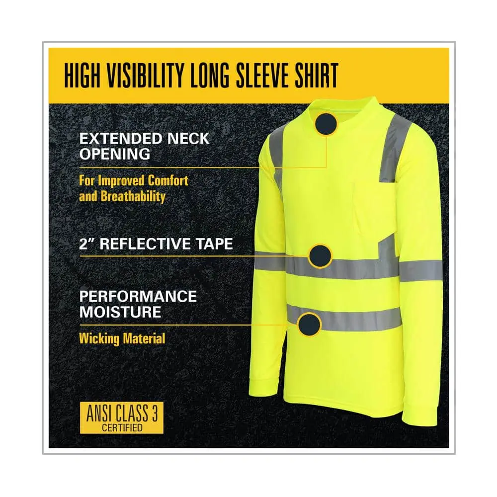 Stay visible and protected in any work setting with this ANSI Class 3 Type high-visibility long-sleeve shirt. Made from breathable 100% polyester knit fabric, it delivers lasting comfort throughout the day. The bright hi-visibility yellow color and retro-reflective tape across the body and shoulders enhance visibility during both daytime and nighttime conditions. A wider neck opening adds to comfort and breathability, while the exterior chest pocket offers convenient storage. Ideal for construction sites, roadways, and other work zones requiring high-visibility ANSI protection.