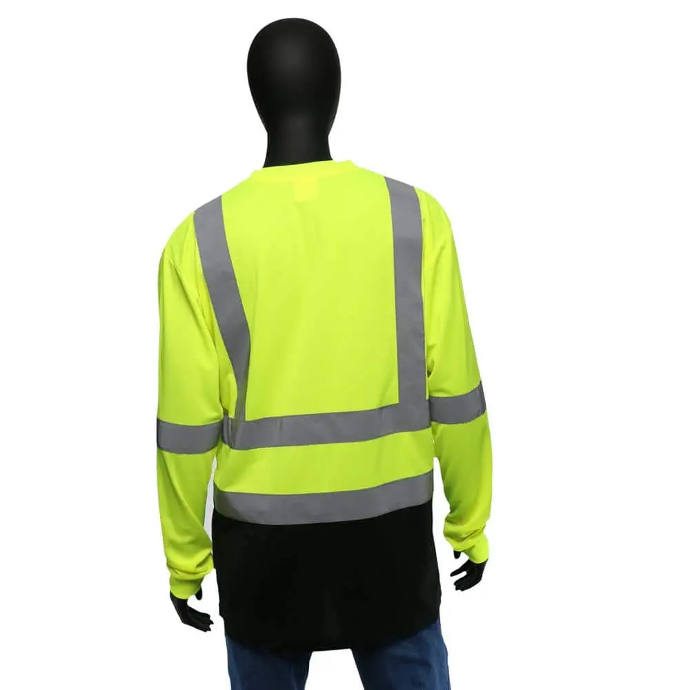 This ANSI Class 3 Type high-visibility long-sleeve shirt provides complete visibility, making it perfect for roadway, construction, and other work environments that require ANSI protection. Featuring a black bottom that effectively conceals dirt and grime, the shirt is made from performance-wicking fabric to keep you dry and comfortable. An exterior chest pocket offers easy access to storage, while the 2-inch reflective tape enhances your visibility in both daylight and low-light conditions. Crafted from 100% knitted polyester, this shirt is breathable and ensures comfort, with retro-reflective tape that shines brightly in various lighting conditions.
