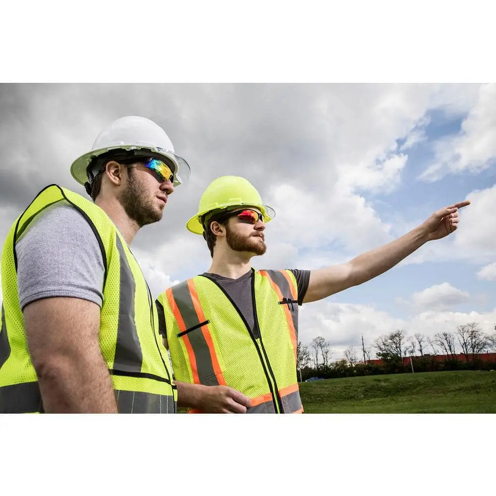 MAXIMUM SAFETY Eyewear combines protection with a sleek, sporty design. The lightweight, semi-rimless frame ensures extended comfort, while the red mirror lens provides UV protection ideal for outdoor environments. A full-view lens offers an unobstructed field of vision, making it a versatile choice for both construction and sports.