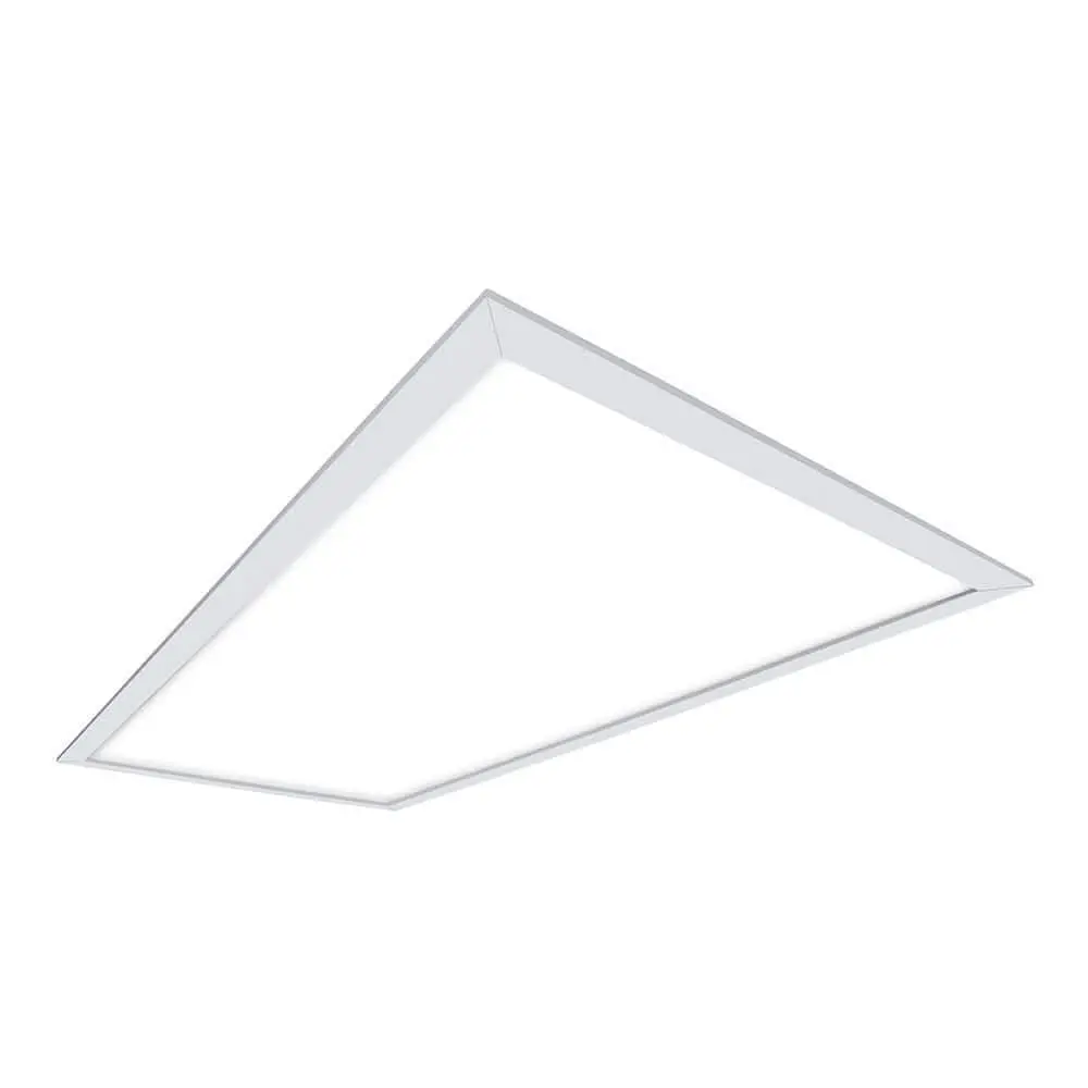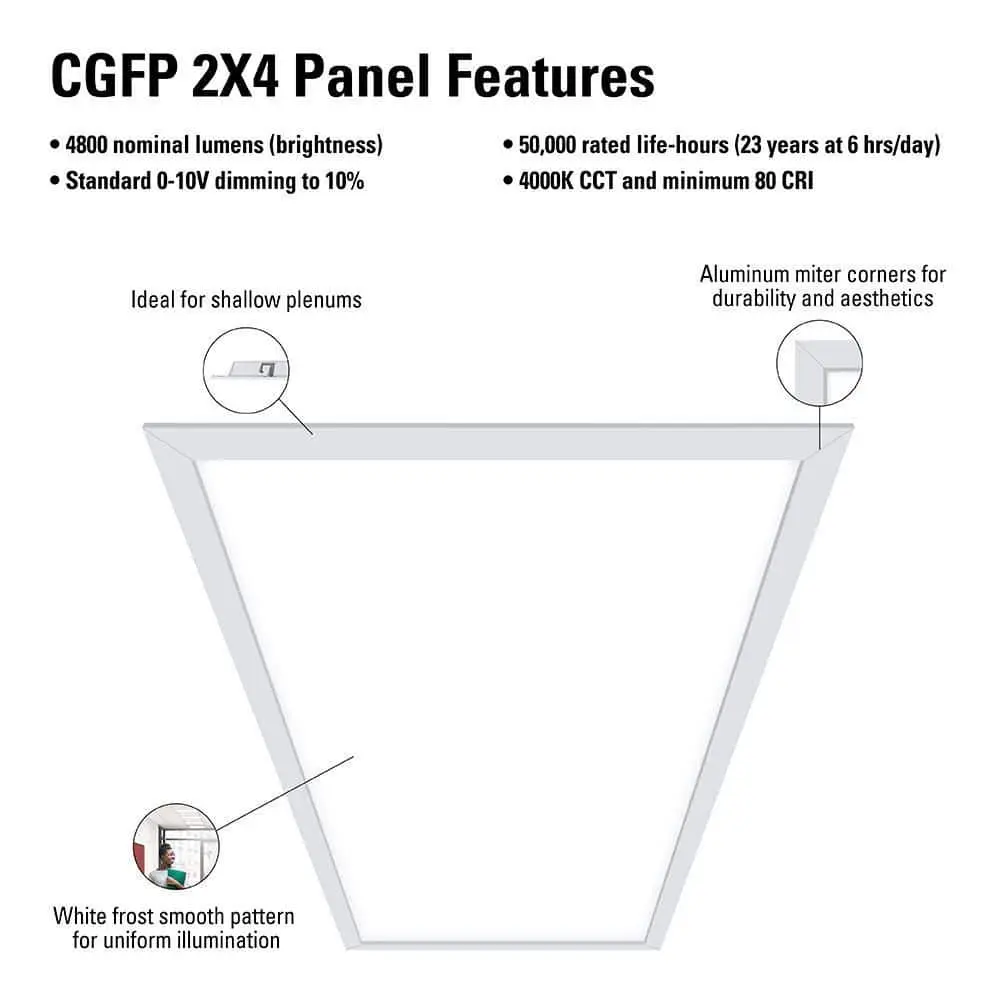 The Metalux CGFP LED Panel features advanced back-lit LED technology with specialized optics, delivering high-quality, glare-free illumination. Designed with a white aluminum trim and a frosted lens, this panel provides a sleek, uniform lighting experience. Equipped with a 120-277V FCC Class B dimming driver, it produces over 4800 lumens (2x4) at just 41W, effectively replacing 96W fluorescent lamps. Its shallow plenum design allows for easy installation in grid ceilings, as well as surface or suspended mounting with an accessory kit. Ideal for residential spaces, schools, offices, basements, and commercial applications.