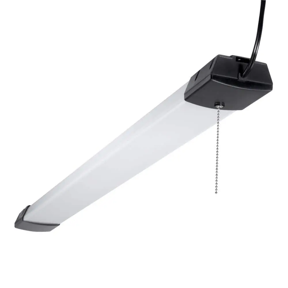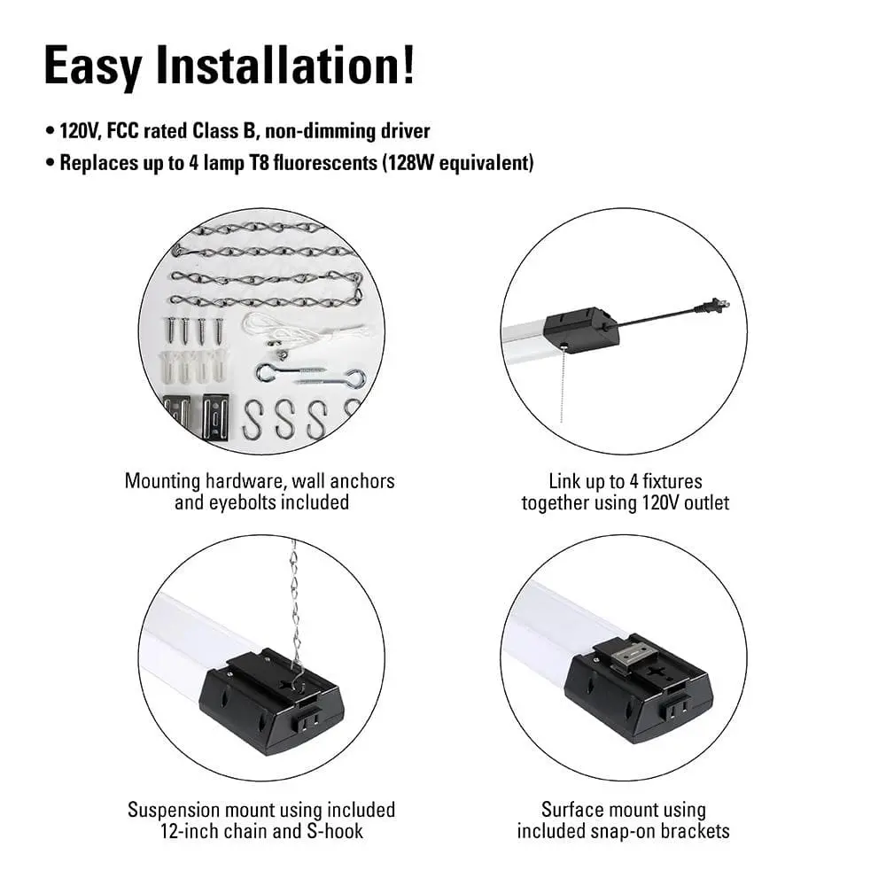 The Metalux 46 in. 10,000-Lumen SHP LED is a high-output, lightweight, pre-assembled shop light. Designed for easy installation, it features a 5 ft. power cord for simple plug-and-play operation. With 10,000 lumens and 85W power consumption, this LED fixture efficiently replaces up to 128W fluorescent lamps. An integrated extra outlet allows linking up to four fixtures for added flexibility. The frosted lens ensures excellent light distribution, while LED technology delivers long-lasting, energy-efficient performance—running maintenance-free for up to 50,000 hours. Ideal for garages, workshops, barns, and other open areas.