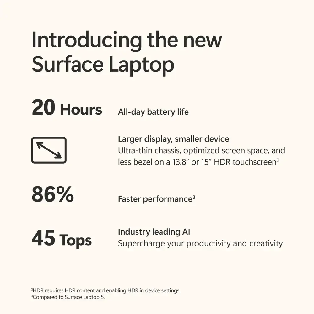 The new Surface Laptop combines exceptional power with an ultrathin design. It’s not just faster—it’s smarter. Enjoy enhanced performance that ushers in a new AI era, enabling Copilot experiences that transform how you work, boosting productivity and creativity. Discover stunning visuals on its sleek, razor-thin touchscreen display like never before.