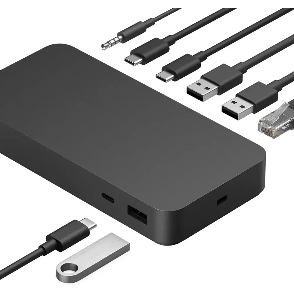 The Microsoft Surface Thunderbolt 4 Dock offers Thunderbolt 4 connectivity, providing fast data transfer and seamless device connections. It supports dual 4K display output for enhanced multitasking and visual clarity, making it perfect for professionals and creatives. With multiple USB ports, you can easily connect a variety of peripherals, while the Gigabit Ethernet port ensures stable and high-speed internet connections. This dock delivers power delivery up to 96W, allowing you to charge your laptop or other devices. Its compact and sleek design in black adds a professional look to your workspace, and the plug-and-play setup makes installation simple without the need for extra drivers. It is compatible with Surface devices and other laptops with Thunderbolt 4 support