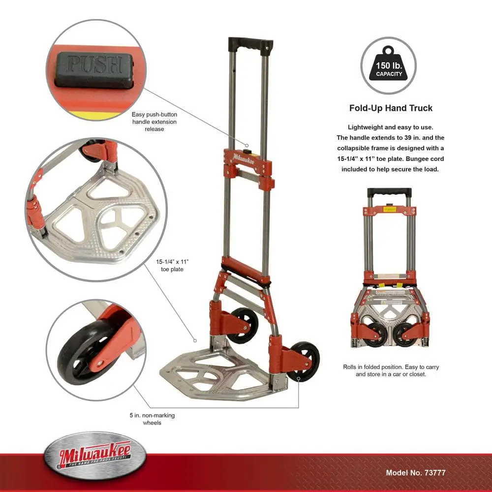 The Milwaukee 150 lbs. Convertible Fold-Up Steel Hand Truck is designed to carry heavy loads with ease, offering a 150 lbs. capacity for reliable transport. Its convertible design allows for a smooth transition from a hand truck to a flatbed, providing versatility for various tasks. The fold-up feature makes it easy to store and saves space when not in use. Built with durable steel construction, this hand truck is made for heavy-duty performance. It also includes a 60 in. bungee cord, adding extra security to keep your load in place during transport, and its lightweight build makes it easy to carry and move around.