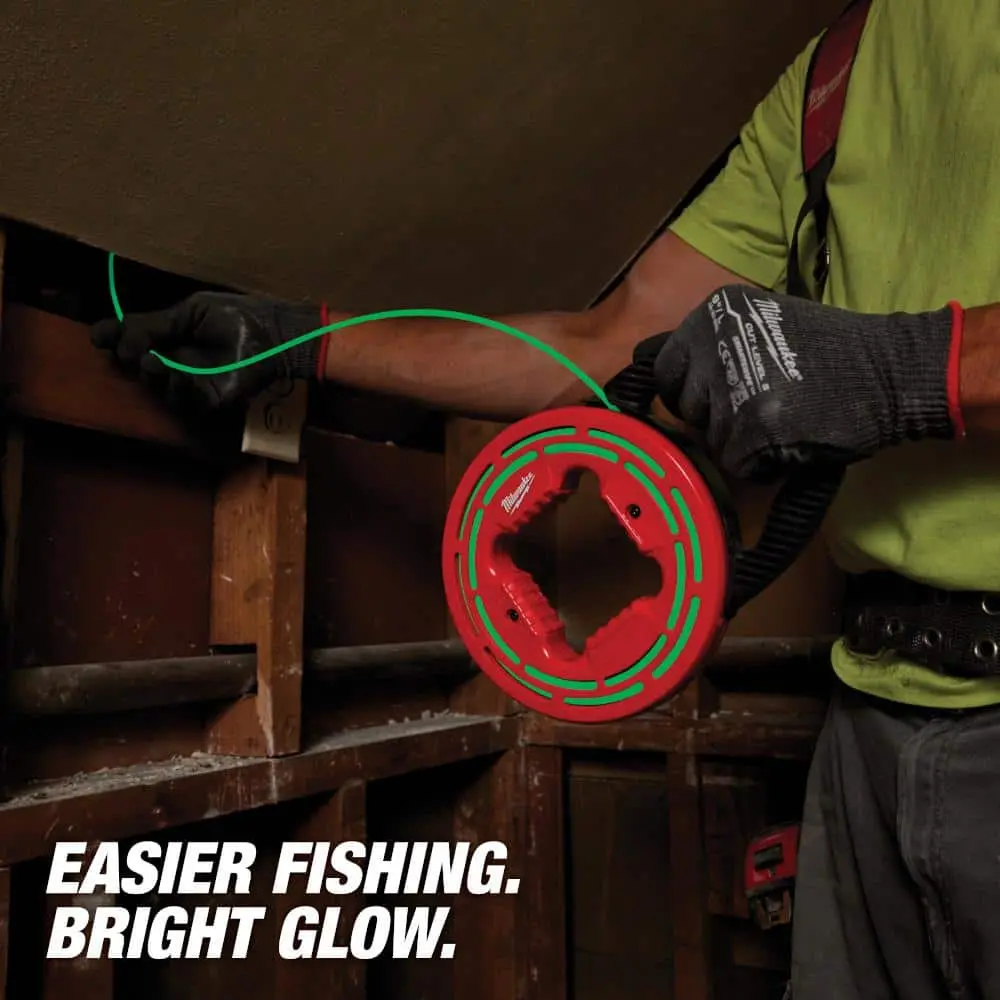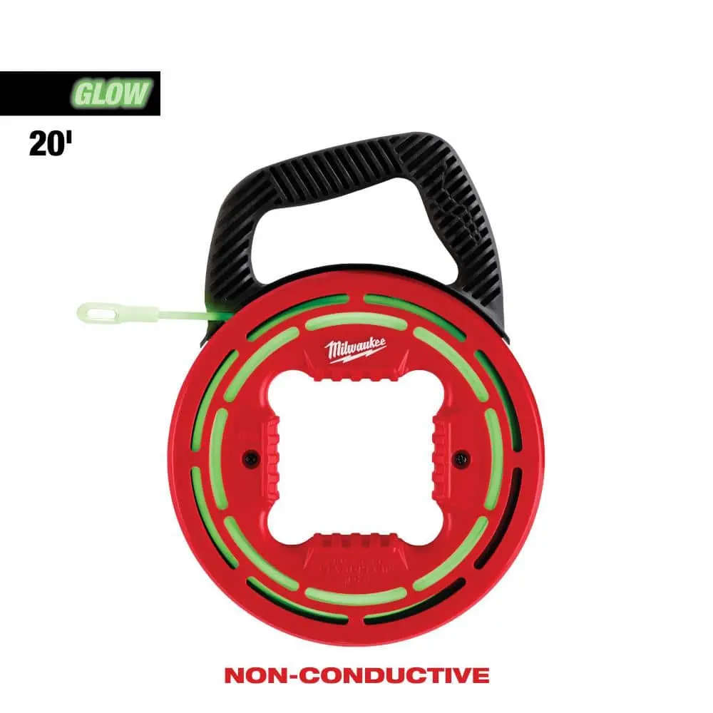 The MILWAUKEE 20' Glow Fish Tape is designed for easy fishing in low-light environments, with a bright glow that helps you see in the dark. Its low-friction case ensures smooth payout and simple rewind. The open slots in the case allow light to charge the tape, providing enhanced visibility. A multi-position handle allows for comfortable use in various scenarios. The non-conductive tape ensures safe handling in electrical applications, while its compact design makes storage and transport easy.