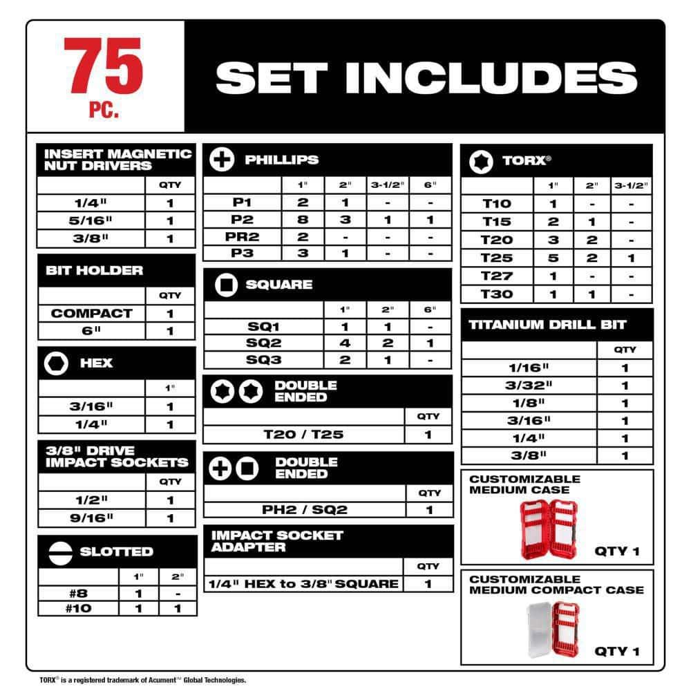 About This ProductThe MILWAUKEE SHOCKWAVE Impact Duty 75-Piece Set offers superior durability and fit for driver bits. The WEAR GUARD TIP enhances wear resistance, while the SHOCK ZONE minimizes breakage by absorbing peak torque. Made from CUSTOM ALLOY76 steel with a specialized heat treatment, these bits last up to 50 times longer than other impact bits. The set is designed for demanding applications and comes in a customizable case compatible with PACKOUT.
