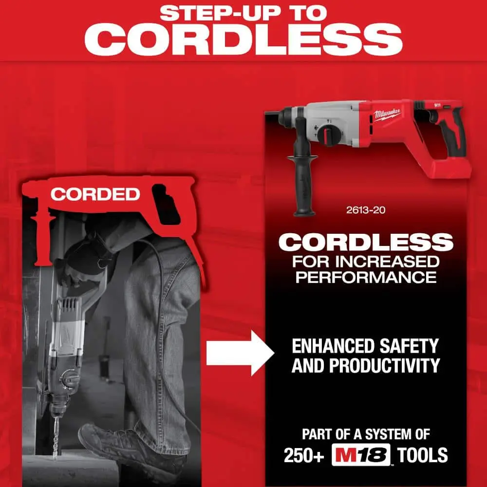 The Milwaukee 1 in. SDS D-Handle Rotary Hammer is a lightweight, fast, and durable tool built for the most demanding applications. It offers up to 40% faster drilling and 15% longer tool life, even in the toughest jobs. Equipped with a powerful 8 Amp motor, it delivers 0 RPM to 1,620 RPM, 0 BPM to 5,860 BPM, and 2.1 ft./lbs. of torque for superior drilling speed and the ability to handle larger holes. Weighing just 6.1 lbs., this tool minimizes user fatigue while maximizing performance. A mechanical clutch safeguards the motor in case of bit binding, and its versatile 3-mode operation (rotary hammer, hammer only, and rotation only) ensures optimal functionality for different tasks. The kit includes a side handle, depth rod, and carrying case for convenience and portability.