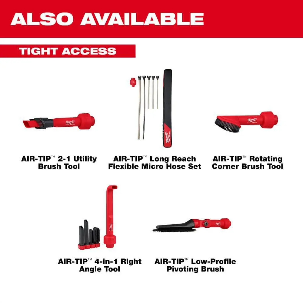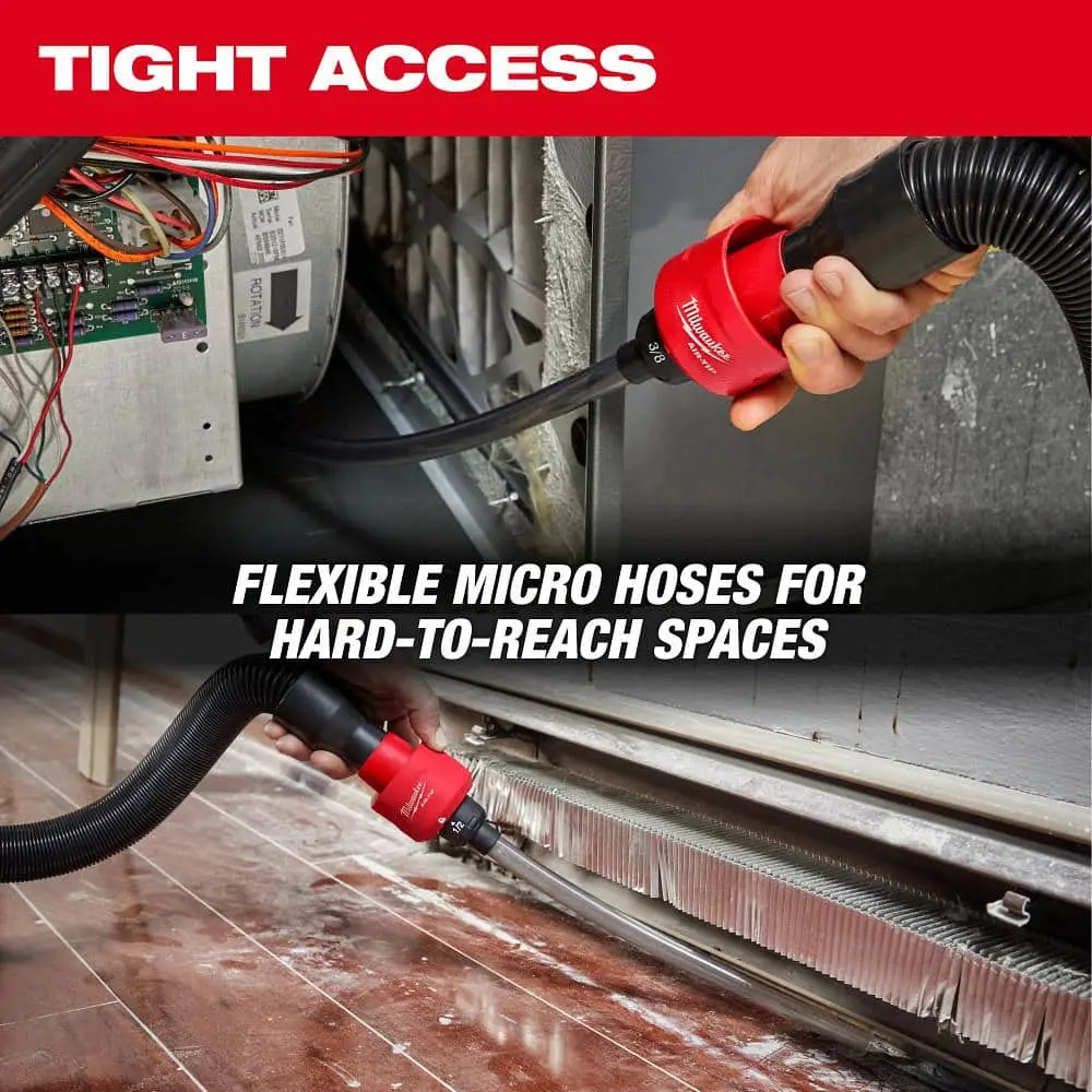 The MILWAUKEE AIR-TIP Long Reach Flexible Micro Hose Set is designed to access hard-to-reach areas with ease, offering (5) interchangeable hose lengths and diameters to suit a variety of cleaning needs. With a simple quarter turn, you can quickly swap out hoses for optimal performance. The kit includes: (1) 5/8" x 2' Flexible Hose, (1) 3/8" x 2' Semi-Rigid Tube, (1) 1/2" x 1' Flexible Hose, (1) 3/8" x 1' Flexible Hose, (1) 1/4" x 1' Flexible Hose, and a durable storage case. This versatile set is compatible with other wet/dry vac brands featuring 1-1/4", 1-7/8", and 2-1/2" diameter connections, and is part of the AIR-TIP family of specialized vacuum accessories designed for trade professionals.