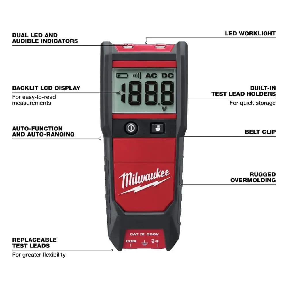 The Milwaukee Auto-Voltage/Continuity Tester combines high-performance electrical meter features into a simple, accurate, and efficient tool. Unlike traditional testers that only provide broad voltage readings, this tester offers precise measurements down to the decimal and displays them clearly on an easy-to-read LCD. It automatically switches between voltage or continuity testing based on the application and is compatible with accessories like belt clips and magnets. The built-in LED work light ensures visibility in low-light environments, and the test lead holders keep probes stored securely when not in use. This tester is ideal for outlets, switches, wires, and breaker panels, making it the perfect choice for residential electricians, apprentices, and journeymen who need a reliable and affordable tool.