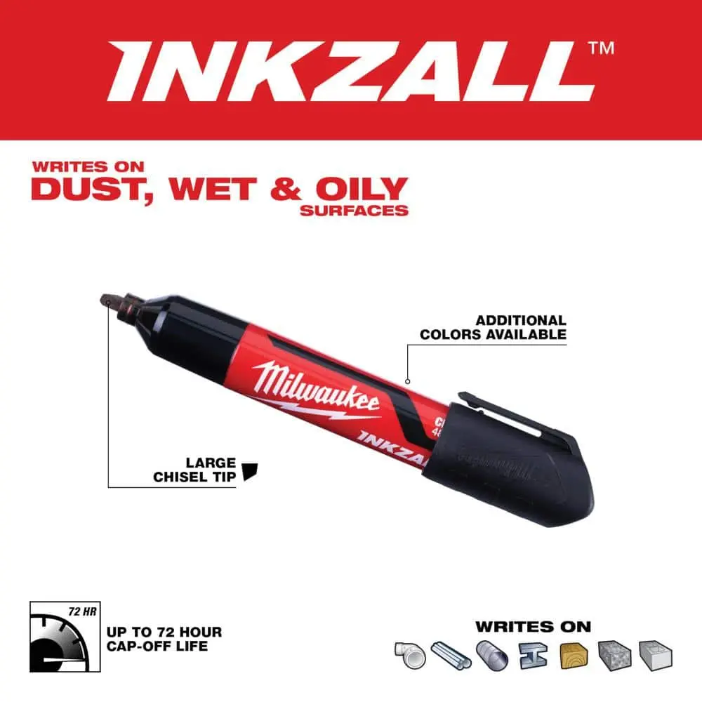 The Milwaukee INKZALL Black Large Chisel Tip Jobsite Permanent Marker (3-Pack) is designed for durability and visibility on the job. Featuring a large chisel tip, it creates bold, consistent marks that are easy to see, even in tough environments. The permanent ink ensures long-lasting markings that won’t fade easily, while the water-resistant ink is built to withstand jobsite conditions. This set includes a pack of 3 markers, offering extended use and great value. With its comfortable grip, the marker allows for easy handling and precise control during marking tasks