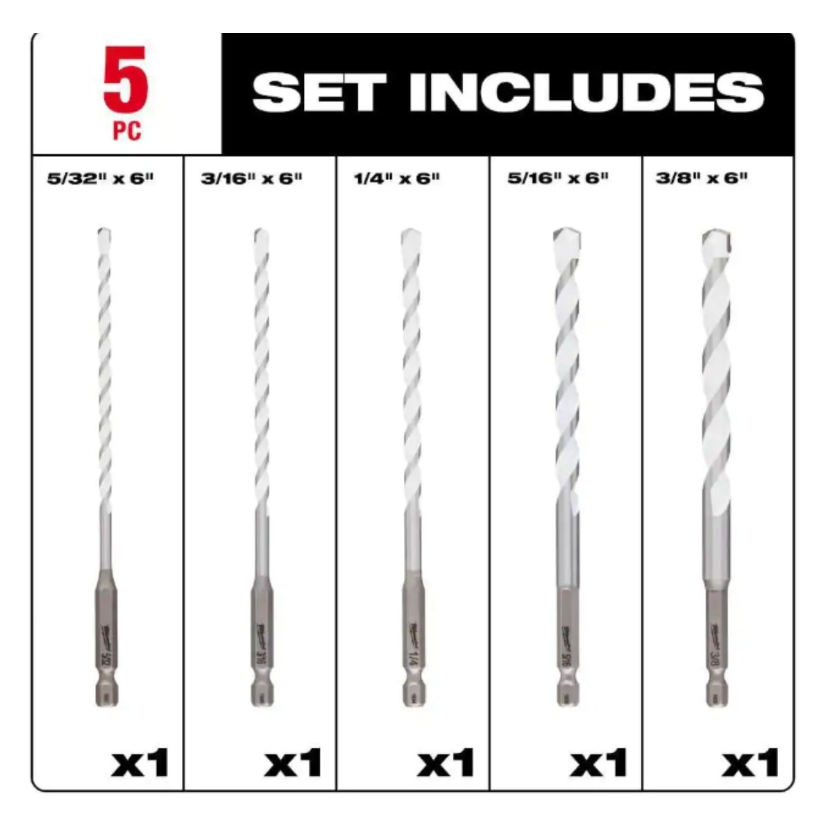 The MILWAUKEE 5-Piece SHOCKWAVE Impact Duty Carbide Multi-Material Drill Bits offer exceptional versatility, capable of handling a wide range of materials such as brick, block, concrete, steel, aluminum, ceramic tile, backerboard, wood, PVC, and drywall.