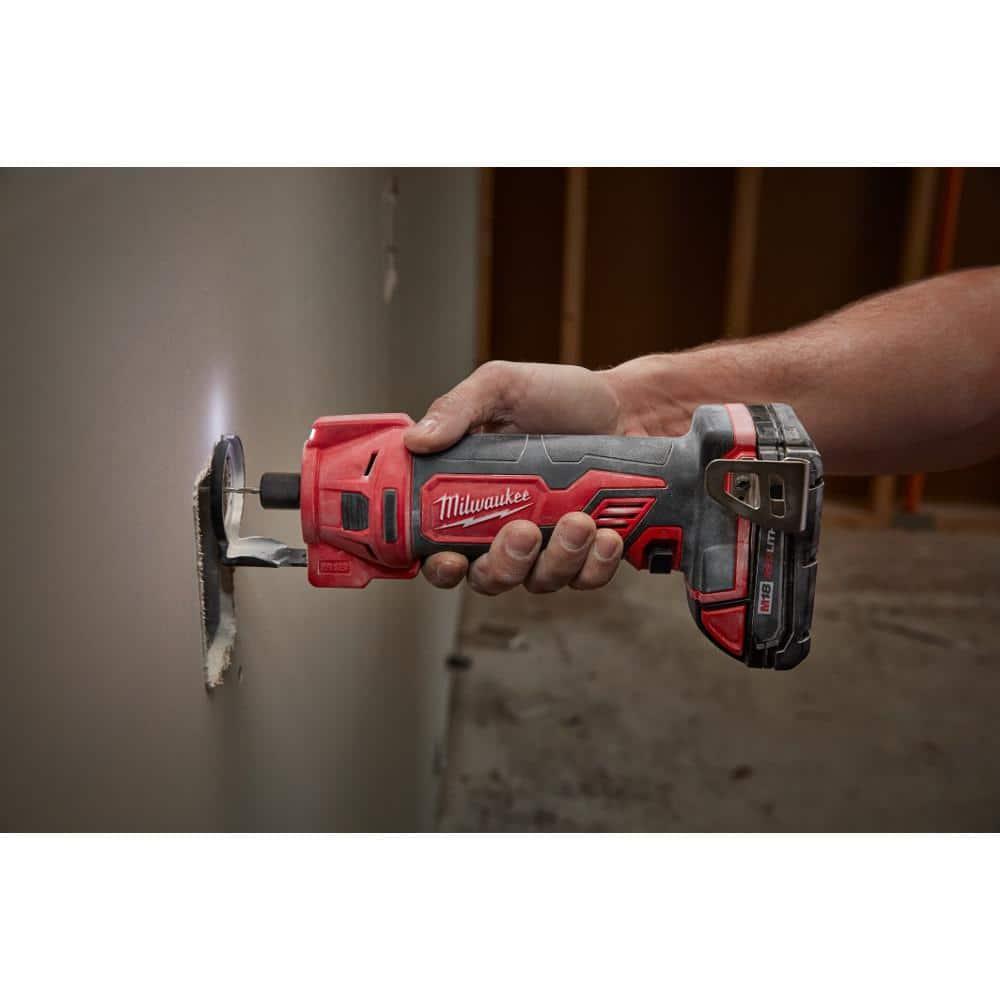 Highlights: 4-pole motor: 28,000 RPM's REDLINK intelligence provides overload protection to defend against abusive situations REDLITHIUM 3.0Ah battery provides up to 120 cuts on one charge Tool free depth adjustment LED light Vent on top of tool to blow debris away from the user Includes: 2627-20 cut out tool, (1) belt clip, (2) 1/8 in. drywall bits, (1) 1/8 in. collet, (1) 1/4 in. collet, (1) wrench Compatible with all M18 batteries and chargers