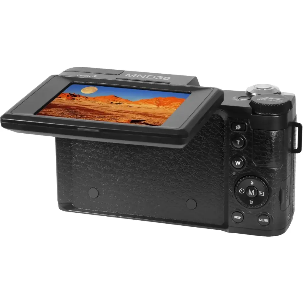 The Minolta MND30 is a user-friendly, compact camera that delivers high-resolution images and sharp 2.7K QHD video in a convenient package. Equipped with a clear lens and 4x digital zoom, this camera is versatile enough for various shooting scenarios. Thanks to a powerful sensor, it captures 30-megapixel stills and 2.7K video with impressive clarity. The 3.0" 230k-dot articulating IPS LCD screen and built-in retractable flash make image composition and review simple. The camera features a microSD card slot, preloaded with a 32GB card, and is compatible with cards up to 128GB. Additionally, intelligent scene modes ensure optimal results, and the 52mm front lens threading allows for attaching lenses and filters.