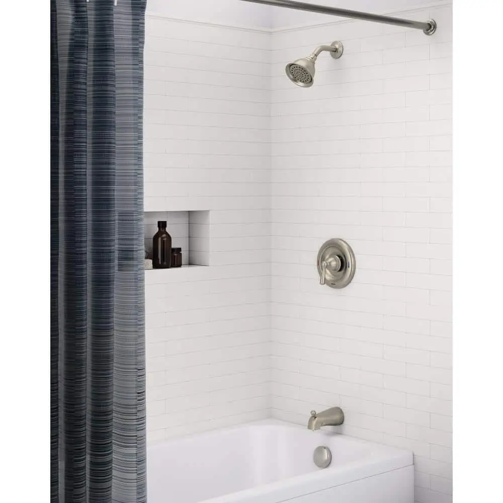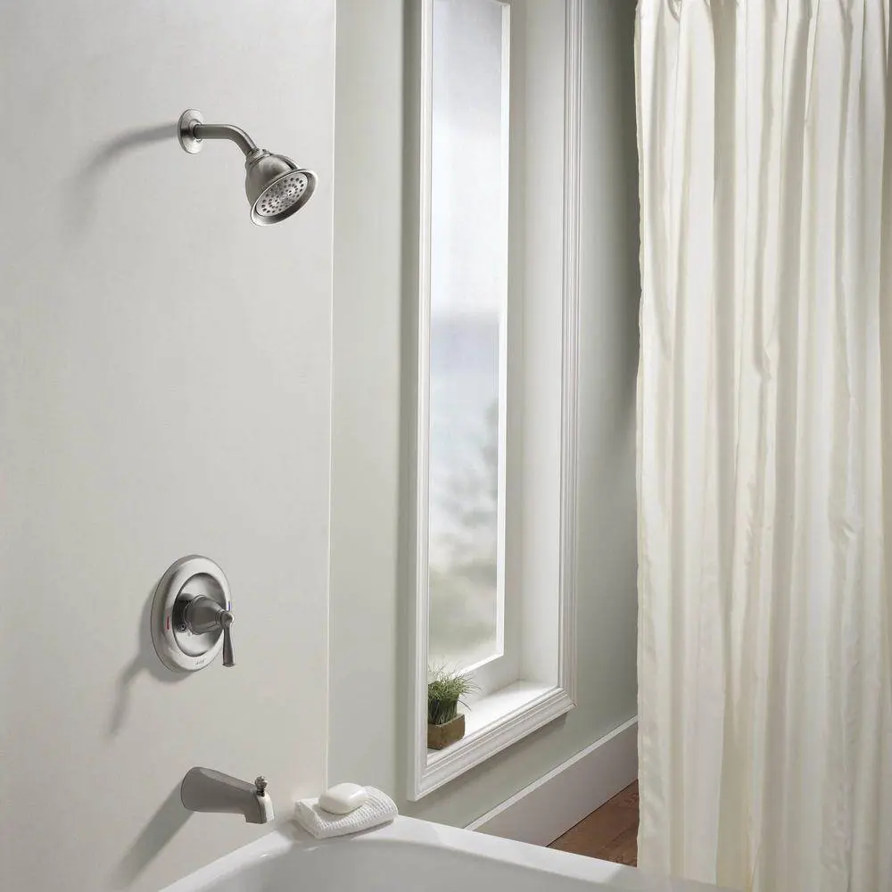 The MOEN Banbury 1-handle tub and shower faucet features a transitional design that adds simple elegance to any bathroom. The easy-to-use lever-style handle is complemented by a pressure-balance valve that prevents sudden bursts of hot or cold water when other fixtures are in use. With self-cleaning nozzles and a spot resist finish, this faucet stays looking fresh and clean day after day.