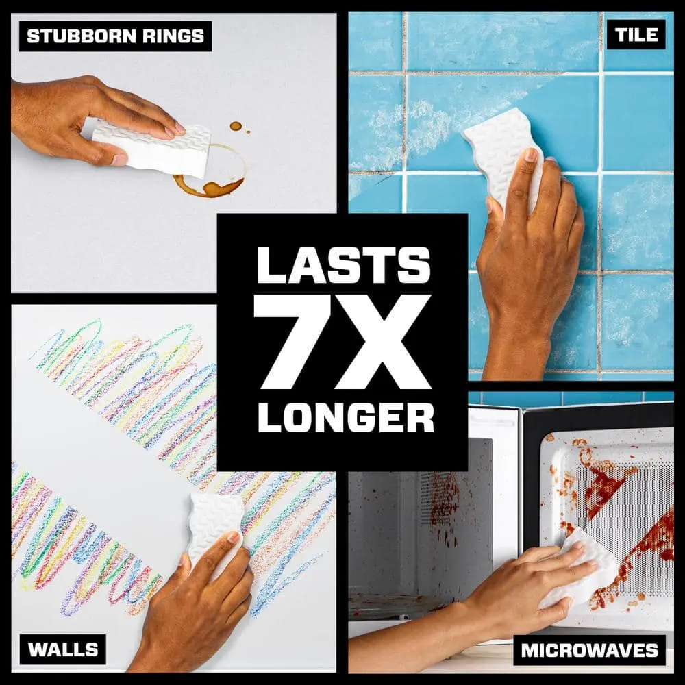 The Mr. Clean Magic Eraser Ultra Thick lasts 7X longer than the original, eliminating the need for other sponges or cleaning products. Simply wet, squeeze, and erase over 150 messes effortlessly. Its heavy-duty micro-scrubbers penetrate deep into surface grooves to lift dirt and grime. This versatile cleaner tackles tough messes around the house—inside and out. Use it in the bathroom for soap scum and water spots, in the kitchen for greasy countertops and stovetops, and outdoors on grill grates and patio furniture. It's also perfect for cleaning shoes and walls. Add this powerful cleaning tool to your supplies today!