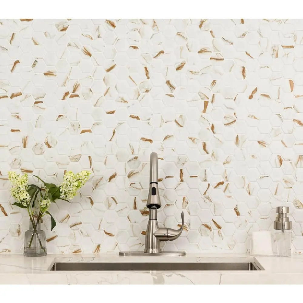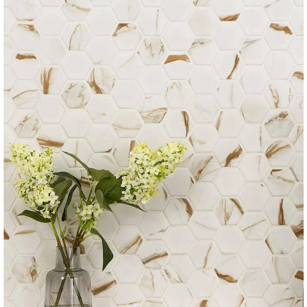 The MSI Calacatta Gold Hexagon 12 in. x 13 in. Matte Porcelain Mosaic Tile features a durable matte porcelain construction, offering both style and longevity. Each tile measures 12 in. x 13 in., covering 0.99 sq. ft. per piece, making it a versatile option for various spaces. Designed with an elegant Calacatta Gold marble-inspired hexagon pattern, it adds a sophisticated touch to any room. Ideal for both floor and wall installations, this tile is water-resistant, stain-resistant, and easy to maintain, ensuring long-lasting beauty. The matte surface enhances its modern appeal, making it a perfect choice for contemporary interiors