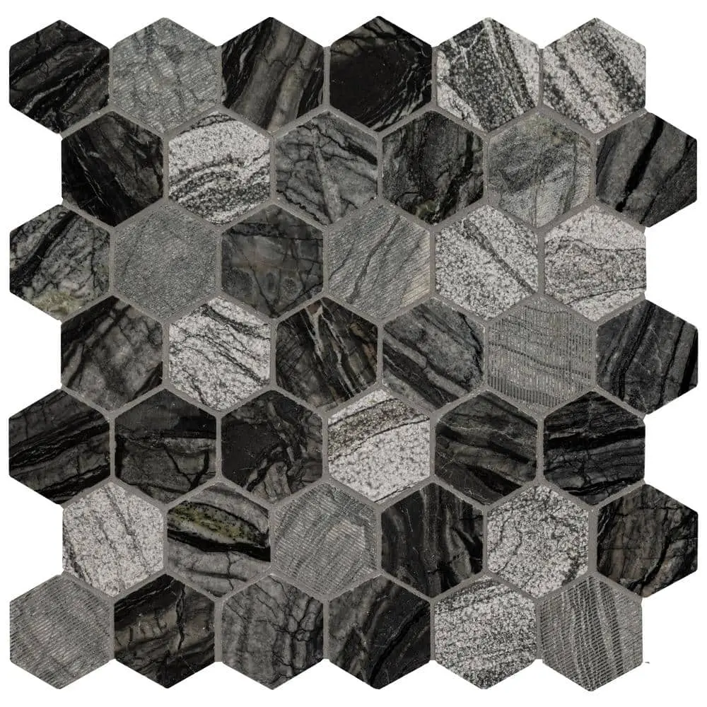The MSI Henley Hexagon Polished Marble Mosaic Tile features an elegant polished marble finish with a stylish hexagon pattern, perfect for adding a sophisticated touch to your space. Ideal for both floors and walls, it works beautifully for backsplashes and accent areas. This tile is durable and low maintenance, resistant to stains and moisture, and easy to clean. The mesh-mounted design ensures simple installation with a pre-arranged mosaic pattern. Each sheet measures 12" x 12", covering 1 sq. ft., offering a timeless appeal that enhances a variety of interior styles.