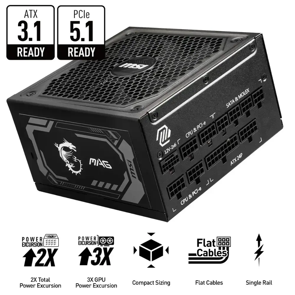 MSI MAG A1000GL PCIE5 1000W 80+ Gold Full Modular ATX 3.1 Gaming PSU