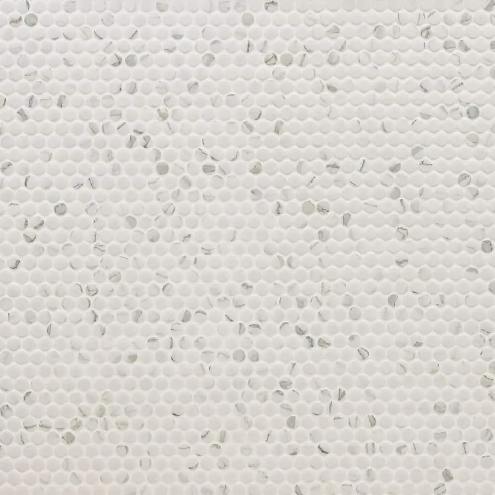 The MSI Penny Round Carrara White 11.3 in. x 12.2 in. Matte Porcelain Mesh-Mounted Mosaic Tile offers a timeless, elegant look with its Carrara white penny round design. The matte porcelain finish adds sophistication to any space, while the mesh-mounted design makes installation and cutting simple and efficient. This tile is ideal for creating stunning backsplashes, accent walls, and shower areas. Durable, easy to maintain, and suitable for both residential and commercial use, it provides both style and functionality for any design project.