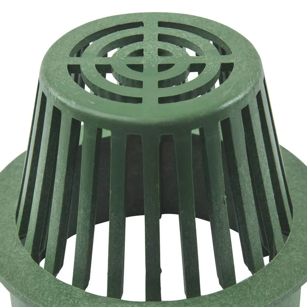 The 6 in. Atrium Drain Grate is specifically designed to effectively drain areas filled with heavy mulch, while trapping leaves, mulch, and other debris at the base. The raised dome grate allows water to flow through the top into the drain pipe, ensuring proper drainage. Perfect for handling moderate stormwater flows, this grate is ideal for mulched landscape beds, natural areas, and window wells. With a 28 sq. in. open surface area and a flow rate of 87 GPM, it efficiently manages water runoff. The grate connects to the Spee-D Catch Basin Drain, 6 in. sewer and drain pipes, fittings, and 6 in. single-wall corrugated pipes for a secure, soil-tight fit. Constructed from durable polyethylene treated with UV inhibitors, this drain grate resists fading and cracking from sun exposure. It forms part of a comprehensive drainage system that blocks debris while facilitating water flow through the pipes, which direct water to a discharge point such as a pop-up emitter or into the ground through a dry well or infiltration trench.