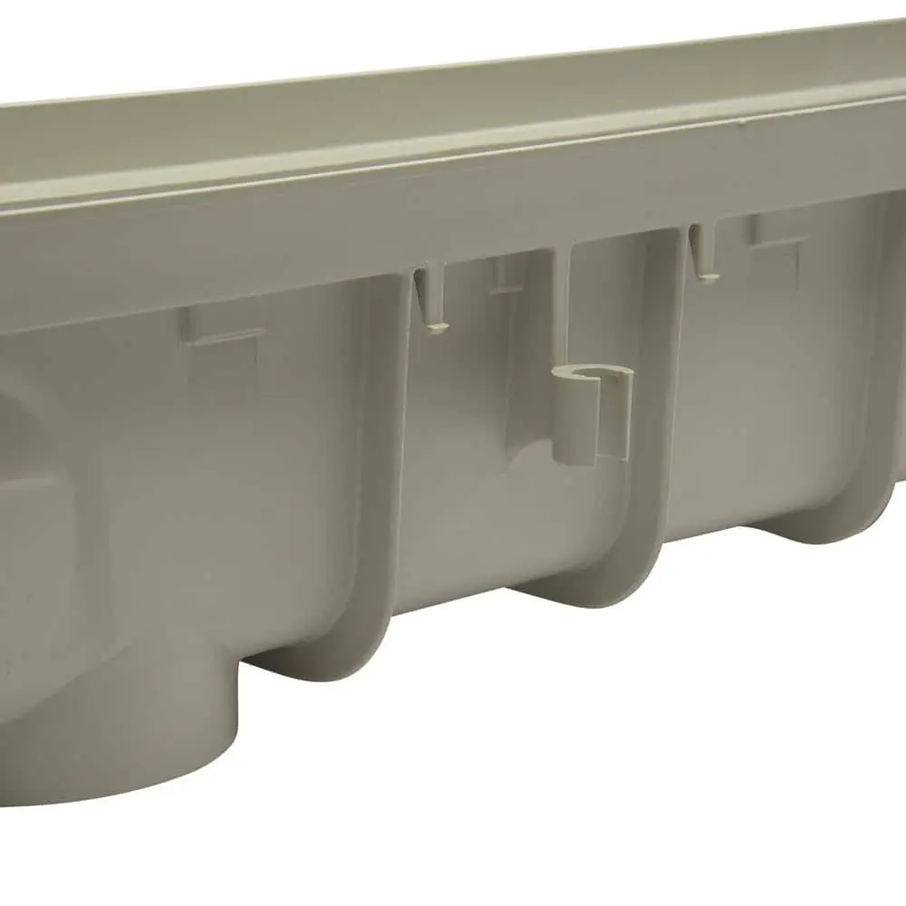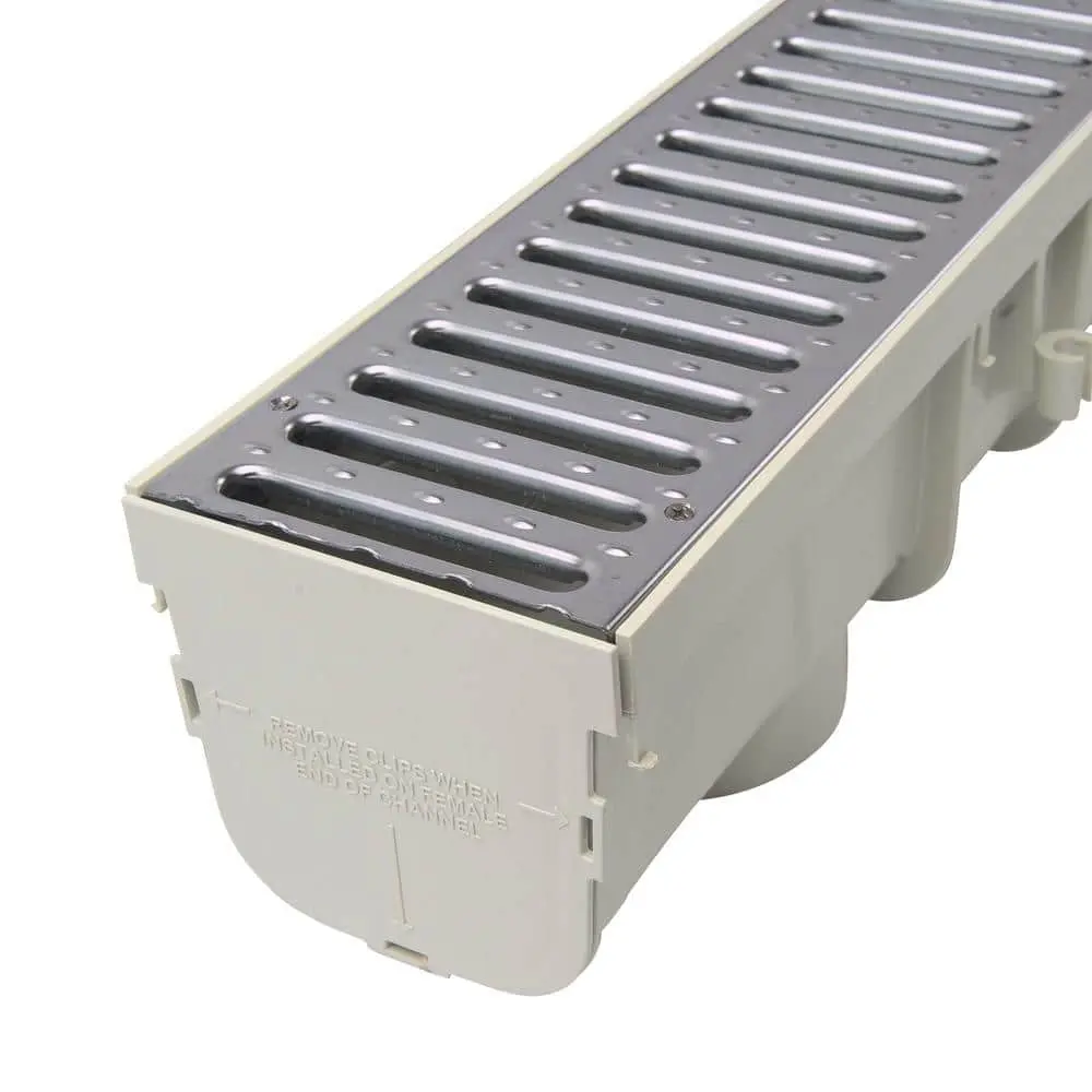 The 5 in. Pro Series Channel Drain, Deep Profile, provides an effective solution for draining excess water and preventing property damage. This highly durable modular drain system is ideal for handling moderate water flows from driveways, patios, courtyards, walkways, and sports facilities. The kit includes a 4-3/4 in. deep polypropylene channel, galvanized steel grates, end cap/outlet, and end cap. The interlocking design of the channels eliminates the need for couplings, making installation easy and secure. Channels can be shortened to 4 in. increments using saw guides. With a variety of outlet options, the channel provides 8 different outlet possibilities per section, including integrated bottom outlets and side knockouts. Channel drains, or trench drains, are used for surface drainage, collecting and conveying water to drain pipes that direct it downstream for proper discharge. This system is a proven alternative to traditional concrete drains. NDS is the leader in stormwater management, offering top-quality products and expert support since 1972.