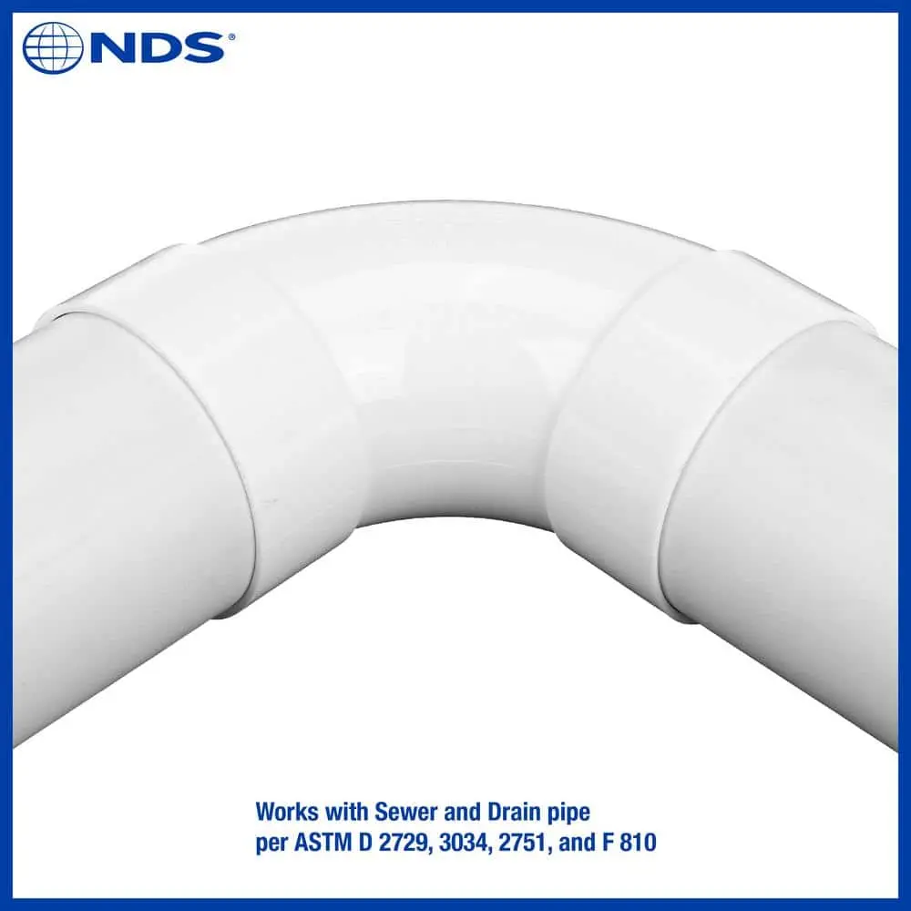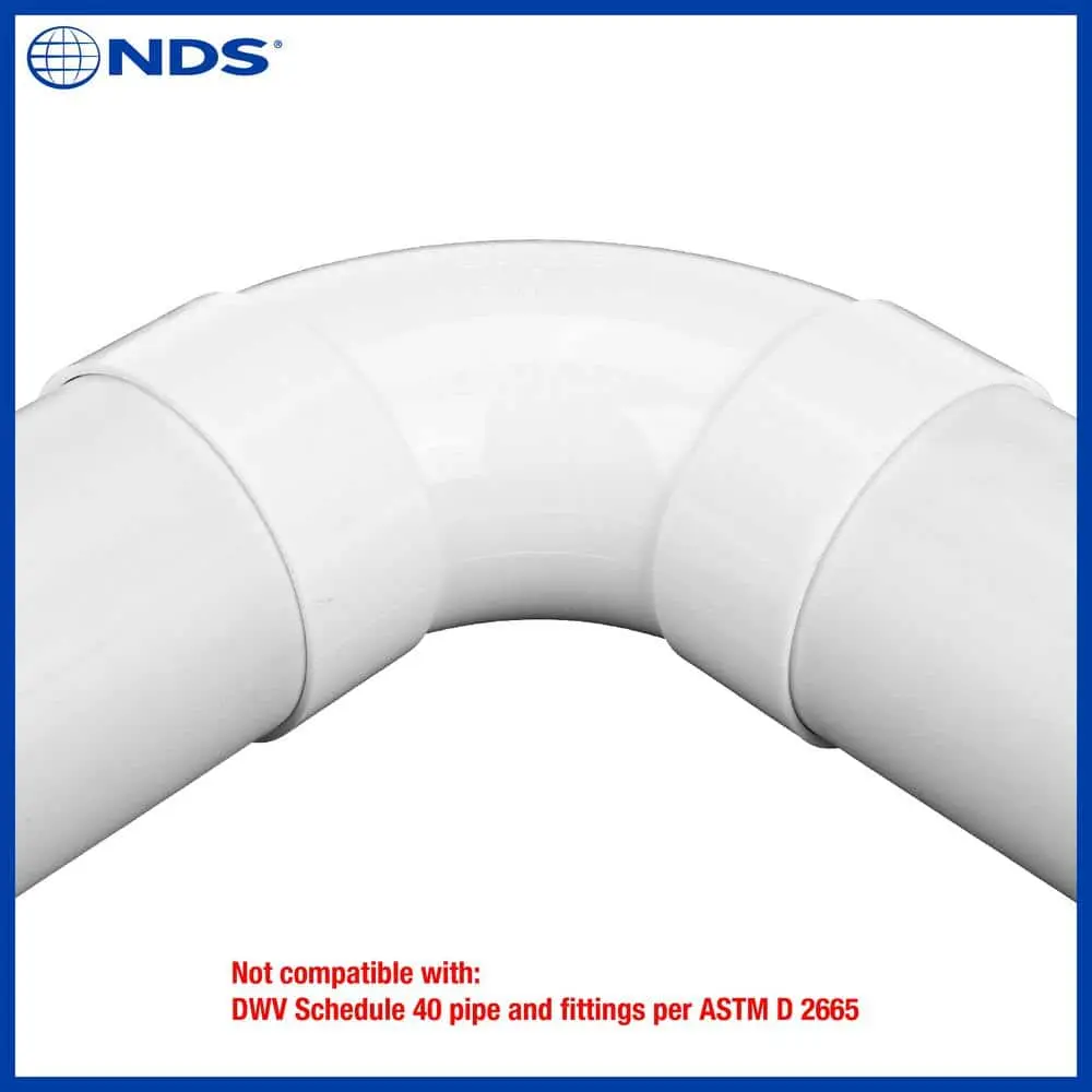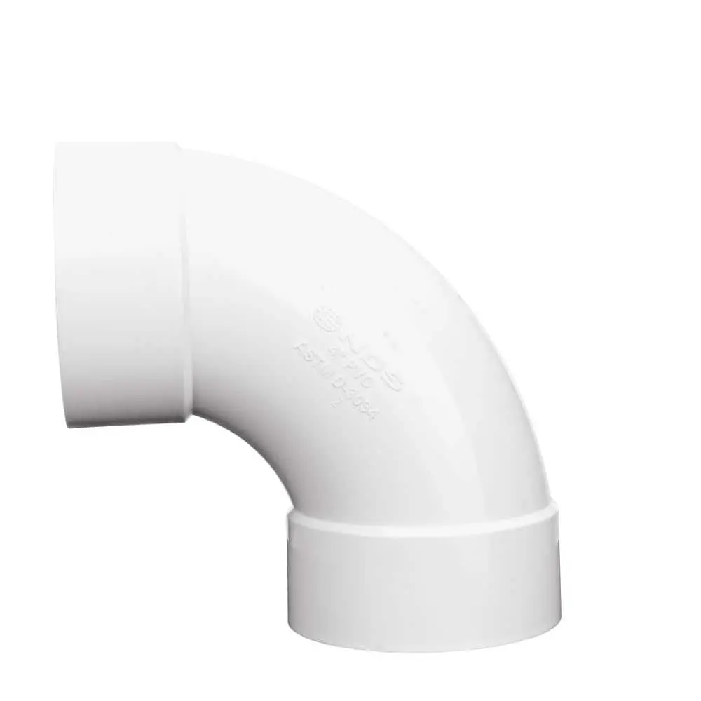 The 4 in. PVC Long-Turn Elbow creates a 90° turn in 4 in. sewer and drain (S&D) pipe runs. This sweep elbow is longer than a standard elbow, reducing turbulence and ensuring smoother, more consistent flow. It connects 4 in. S&D pipe to various compatible drainage products, including channel drain outlets, Flo-Well Dry Well System, drainage grates, and pop-up emitters. Made of durable polyvinyl chloride (PVC) for Hub X Hub solvent-weld connections, this elbow meets ASTM standards and is designed for non-pressurized underground sewer and drainage applications, with a maximum working pressure of 5 psi. Ideal for changing direction in a pipeline, it connects two pipes of the same type and diameter.Ensuring it is free from defects. NDS also offers useful tools, such as the Home Drainage Center, Calculators, and the NDS Stormwater Drainage mobile app, to support your project. Founded in 1972, NDS is a trusted leader in stormwater management solutions, providing proven products, tools, and expert support.