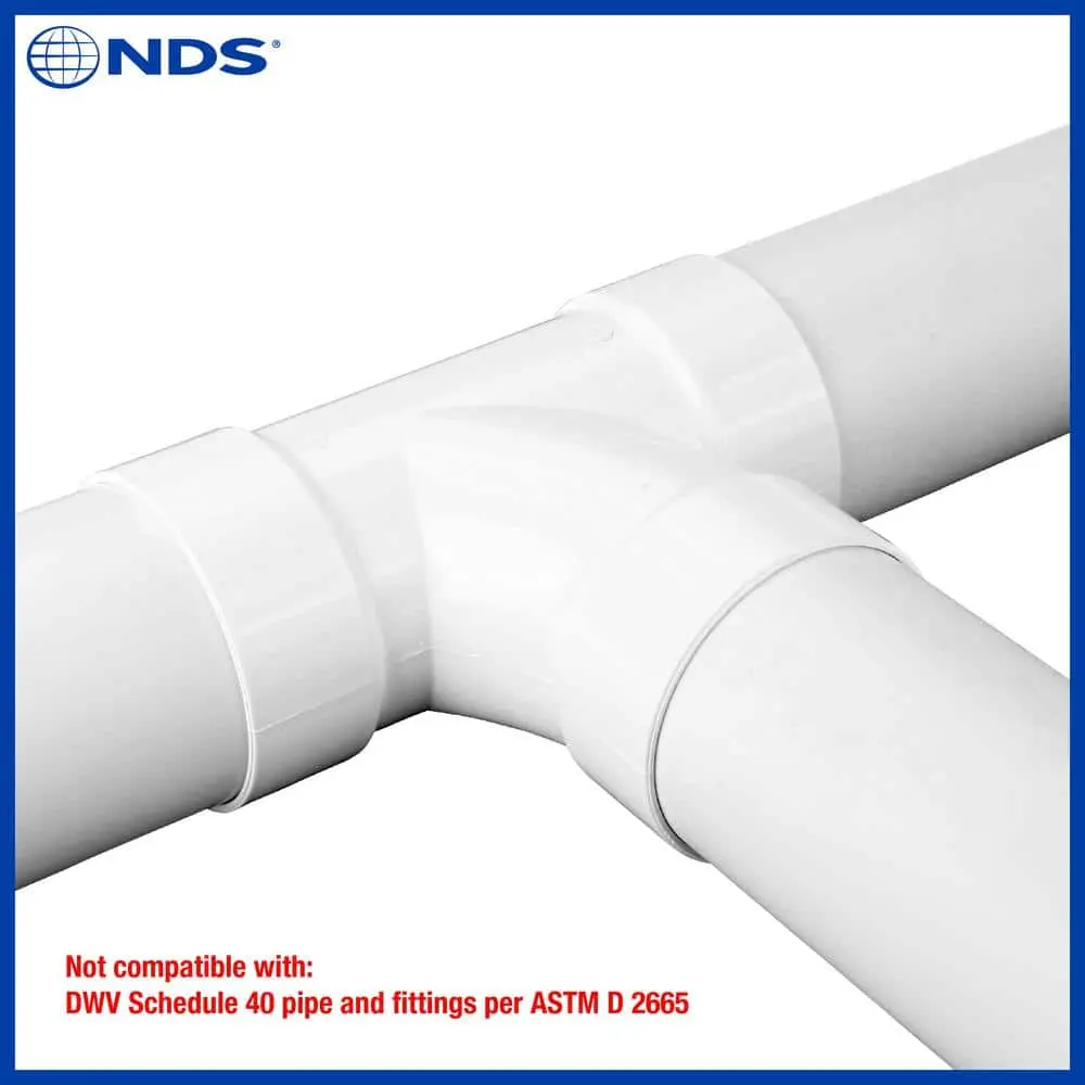 The 4 in. PVC Sanitary Tee creates a 90° downward sweep in a 4 in. sewer and drain (S&D) pipe system. Commonly installed vertically, this San Tee (or Sweep Tee) connects to three lengths of pipe and helps facilitate drainage. It also works with select drainage products like channel drain outlets, the Flo-Well Dry Well System, drainage grates, and pop-up emitters. Made from polyvinyl chloride (PVC), this tee features Hub X Hub X Hub solvent-weld connections. It meets applicable ASTM standards and is designed for non-pressurized underground sewer and drainage systems with a maximum working pressure of 5 psi. This tee is used to add an intersection, assist with smoother drainage flow, and connect three pipes of the same size and type.Ensuring it is free from defects. They also provide tools like the Home Drainage Center, Calculators, and NDS Stormwater Drainage mobile app to support your project. NDS, founded in 1972, is a trusted leader in stormwater management solutions.