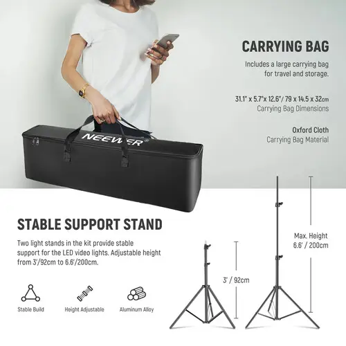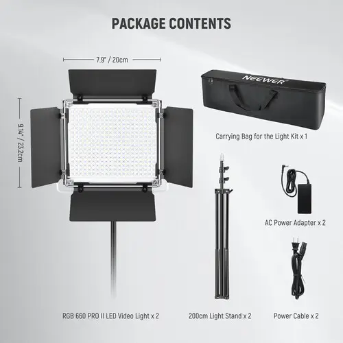 The Neewer Upgraded RGB 660 PRO II LED Video Light Kit 2-pack contains two RGB 660 PRO II LED Video Lights, each with a 78.7" light stand, AC adapter, and 4-way barndoors. It all fits in the included carry bag. Each light has a variable CCT color range from 3200 to 5600K with an accurate CRI rating of 97+. The lights also have an RGB mode that gives the shooter access to literally millions of custom colors.