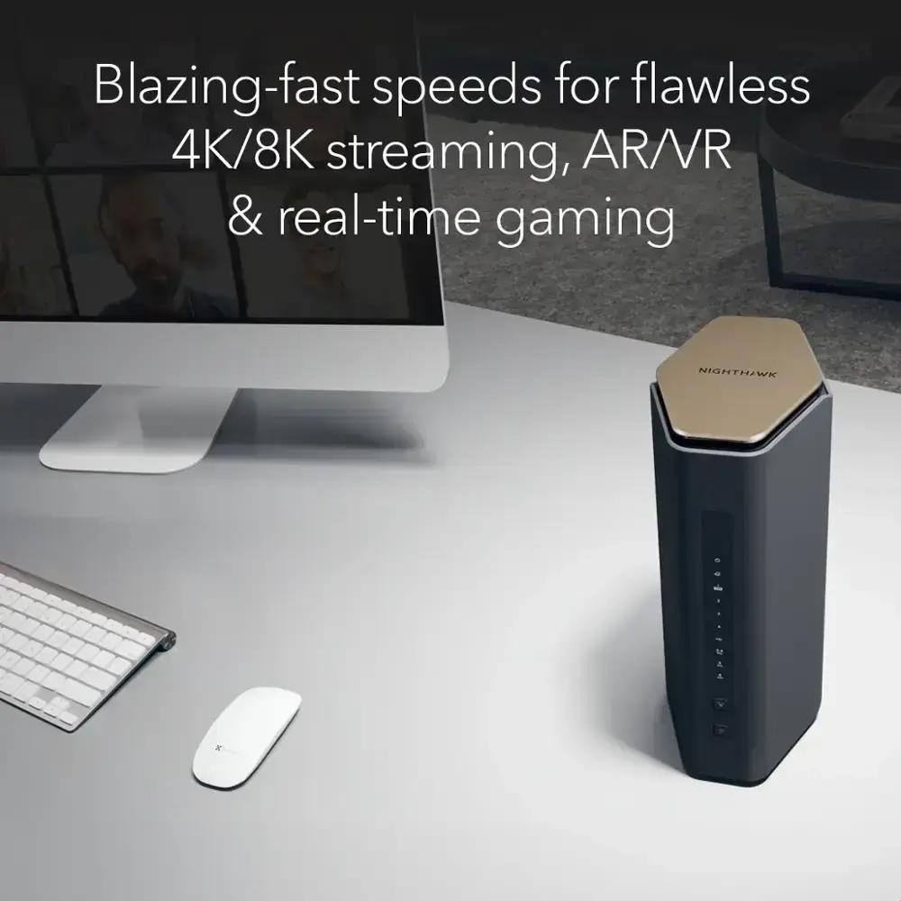 The NETGEAR Nighthawk BE18000 Tri-Band Wi-Fi 7 Router offers ultra-fast speeds of up to 18Gbps with Wi-Fi 7 technology, ensuring seamless streaming, gaming, and browsing. Its Tri-Band connectivity and Multi-Gig Ethernet Ports provide high-speed wired connections for maximum performance. Powered by a powerful Quad-Core Processor, it delivers exceptional efficiency and reliability. Enjoy extensive coverage, perfect for large homes and multiple devices, while benefiting from advanced security features that keep your network and devices protected.