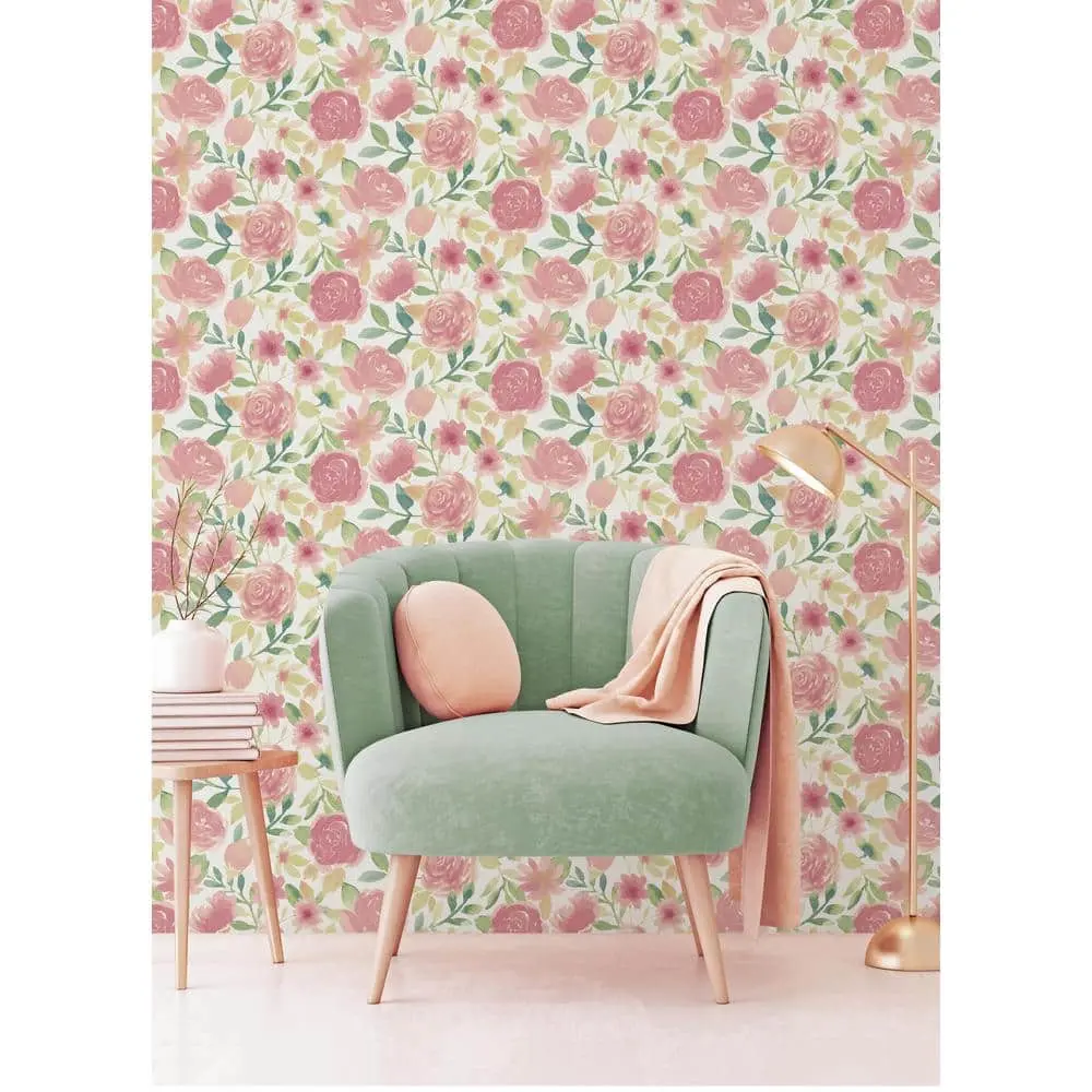 Add a touch of whimsical, feminine charm to your walls with this stunning peel and stick design. Soft watercolor pink florals, accented with vibrant green leaves, beautifully frame the blooms against a clean white backdrop.