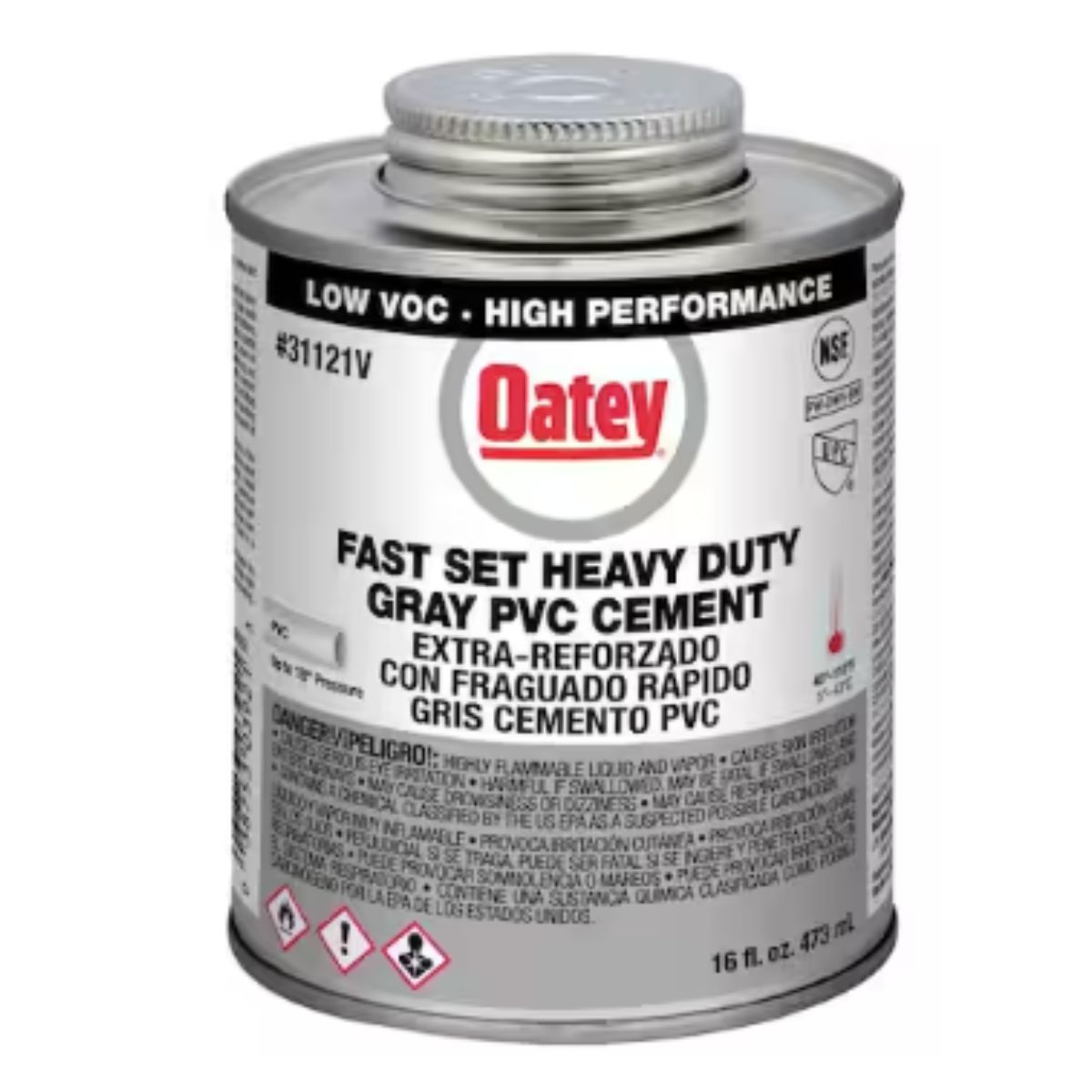 The OATEY PVC Fast Set Heavy-Duty Gray Cement is tailored for DWV, potable water, and irrigation applications, offering fast setting capabilities for quick installation. This heavy-duty cement is designed to effectively bond PVC pipe and fittings, including large diameter and loose fitting joints. It features a medium viscosity that allows it to fill gaps, ensuring a secure weld. The cement comes with an in-lid dauber for easy application and can solvent weld all schedules and classes of PVC pipe and fittings up to 18 inches in diameter for non-pressure applications and up to 12 inches in diameter for pressure pipes. It is recommended for use in temperatures ranging from 40°F to 110°F (4°C to 43°C). Certified to UL GREENGUARD Gold standards for low VOC emissions, this cement meets California SCAQMD and ASTM D2564 requirements, as well as NSF/ANSI 61 health effects standards. With a century-long legacy, OATEY products aretrusted by plumbing professionals for their reliability and performance.