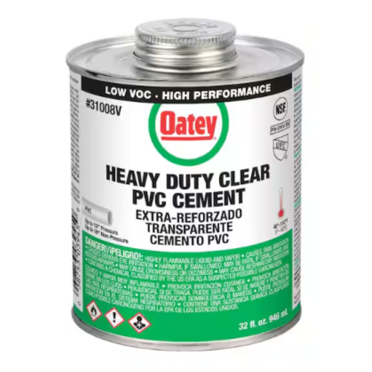 OATEY PVC Heavy-Duty Medium Set Clear Cement is a robust solvent cement designed for various applications including DWV, pressure pipe, potable water, and electrical installations. Its thick formula effectively fills gaps in large diameter pipe and loose-fitting joints, ensuring a strong bond. The included in-lid dauber simplifies application. This clear cement can solvent weld all schedules and classes of PVC pipe and fittings with interference fit up to 18 inches in diameter for non-pressure applications and up to 12 inches for pressure pipes. It performs optimally within a temperature range of 40°F to 110°F (4°C to 43°C) and meets stringent environmental standards such as UL GREENGUARD Gold and low VOC requirements. Additionally, it complies with ASTM standard D2564 and NSF/ANSI 61 health effects requirements, ensuring reliability and safety in plumbing and construction projects. For warranty details, please refer to the OATEY limited warranty.