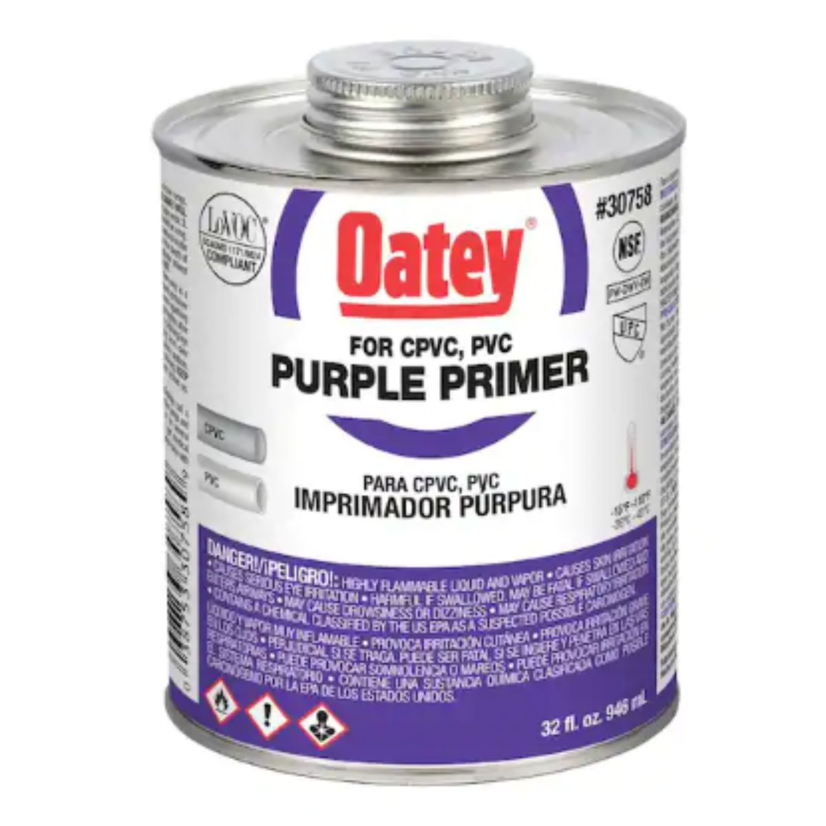 The Oatey 32 oz. Purple Primer is specially formulated with a blend of solvents to effectively cleanse PVC and CPVC pipes by eliminating surface dirt, oils, and other contaminants. It features a purple-tinted color that serves as a visible indicator confirming the application of primer, which is particularly useful in regions where plumbing regulations require such verification. This aggressive primer not only cleanses but also softens the pipe surface, facilitating a quick and secure solvent weld during installations. The primer includes an in-lid applicator for convenient and controlled application. Moreover, it meets NSF listing standards and complies with ASTM F-656 specifications, ensuring adherence to health and safety requirements. Additionally, the primer is classified as low-V.O.C. (volatile organic compounds), meeting environmental standards set by California's South Coast Air Quality Management District (SCAQMD) and BAAQMD Method 40, making it suitable for various environmental and regulatory requirements.