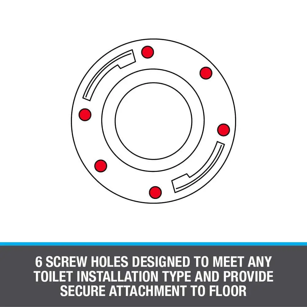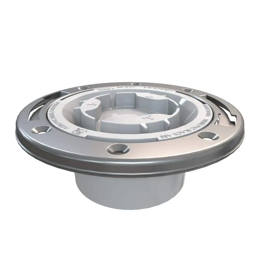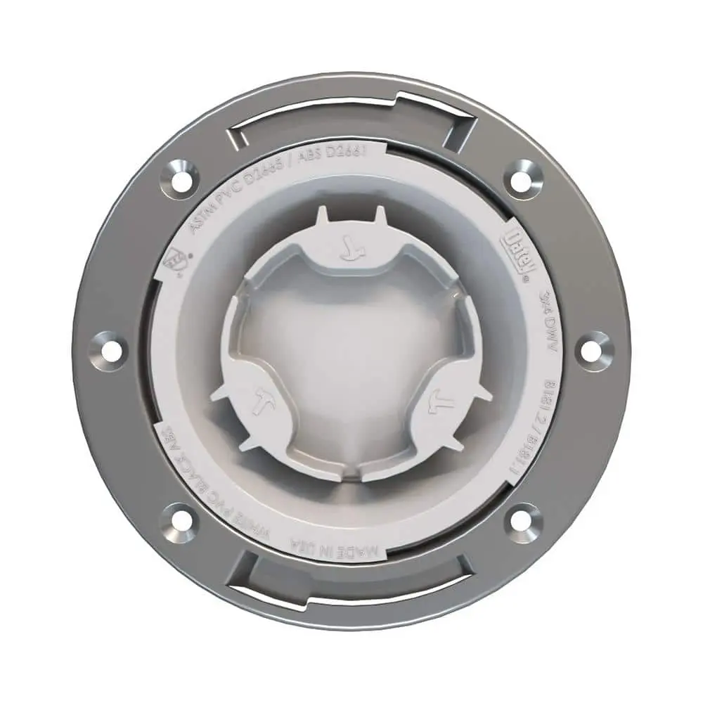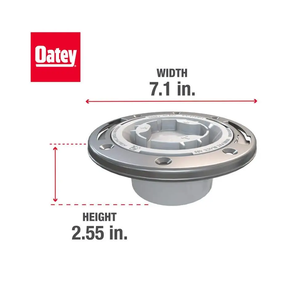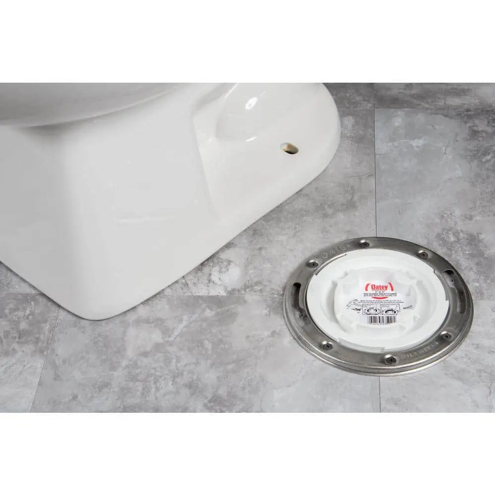 The Oatey Fast Set Easy Tap Hub Closet Flange is designed for quick and reliable toilet installations. It comes with a premolded test cap that cleanly breaks out, preventing it from falling into the DWV line. With six screw holes for secure attachment to the floor, it accommodates various toilet installation types. Made from durable PVC with a stainless steel ring, this flange has patented alignment indicators and bolt slot shelves for added stability.