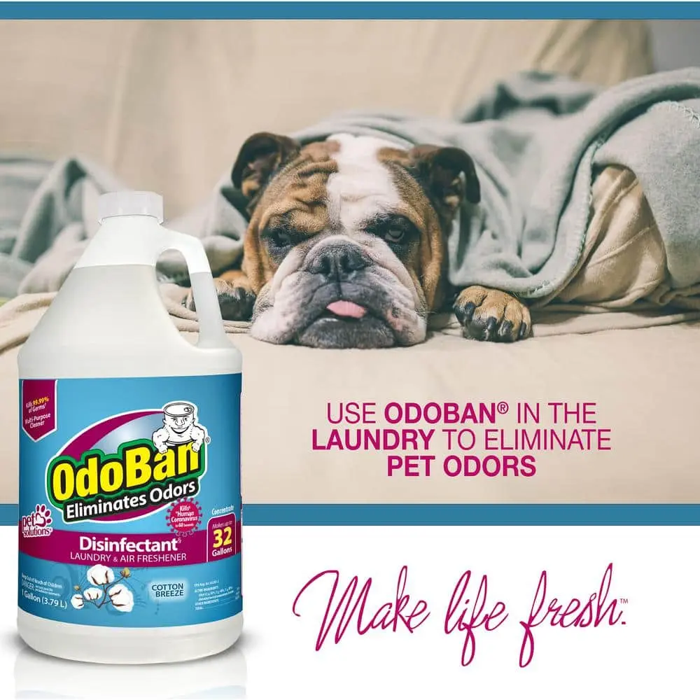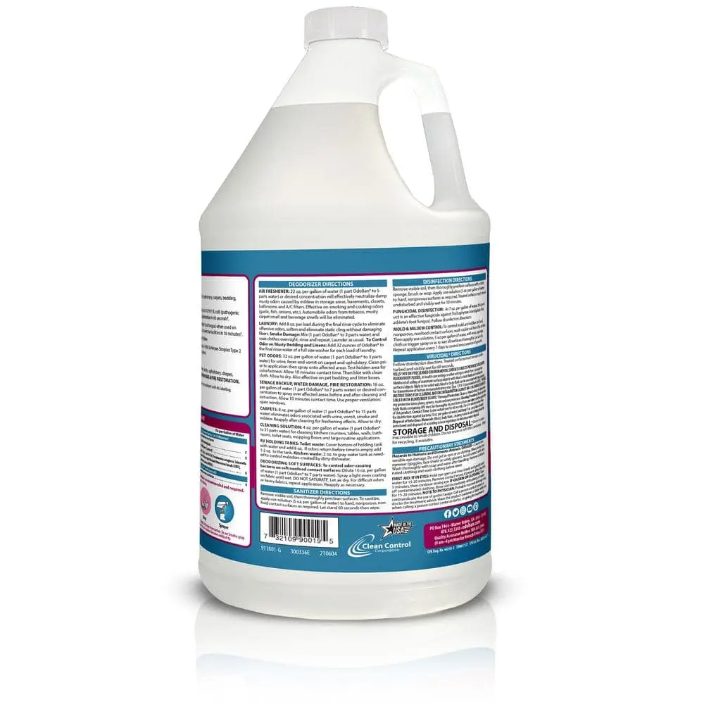 OdoBan Concentrate is a multi-purpose cleaner, disinfectant, sanitizer, air freshener, and odor eliminator. It kills germs and removes odors like pet, smoke, and urine from various surfaces, fabrics, and air. It can be added to laundry to control odors and soften fabrics, and is safe for use on sealed natural stone, stainless steel, ceramic, and other washable surfaces. It also helps control mold and mildew, deodorizes A/C filters and RV holding tanks, and is effective for water damage or fire/flood restoration. One gallon makes up to 32 gallons of cleaning solution when mixed with water.