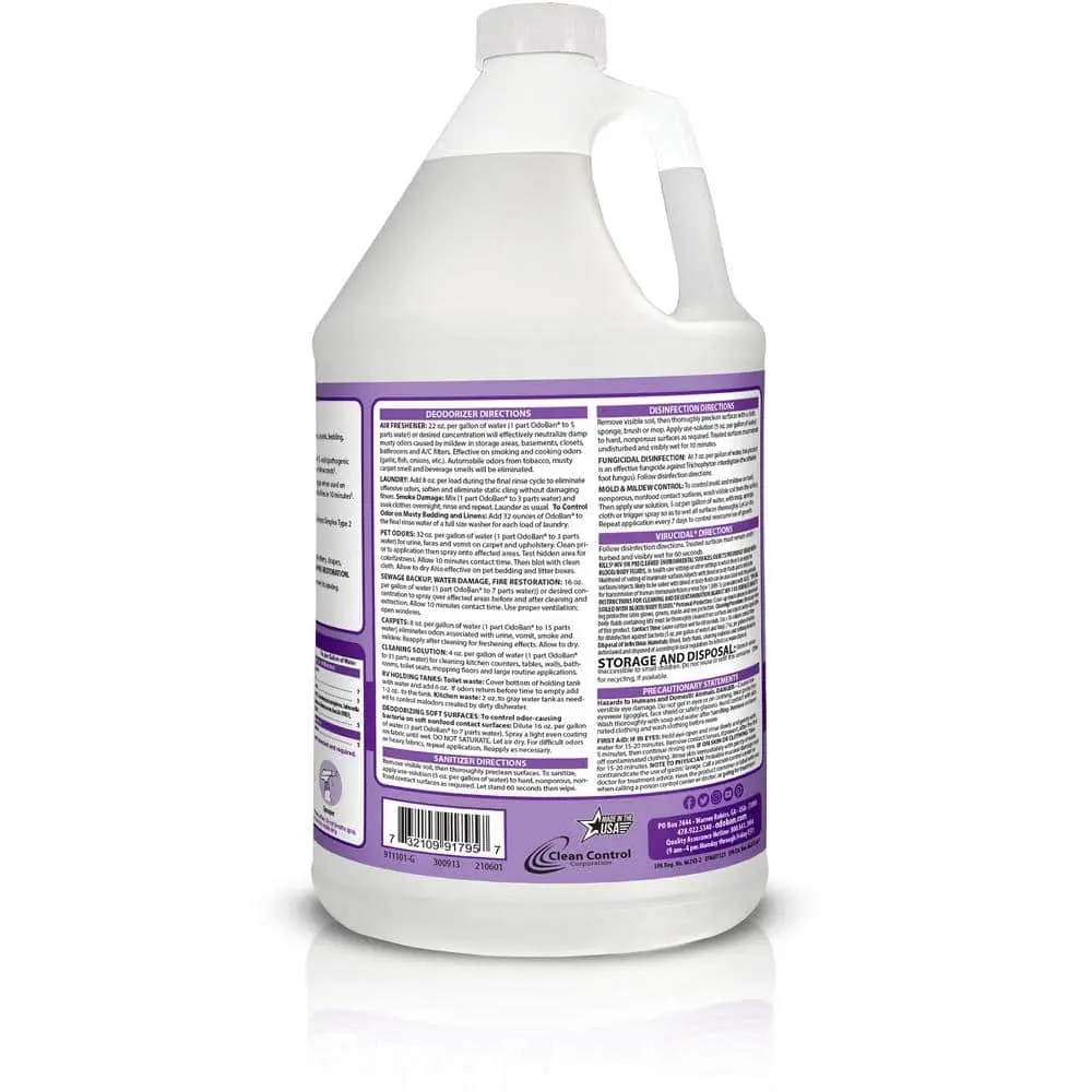 OdoBan Concentrate is a versatile, multi-purpose cleaner, disinfectant, sanitizer, air freshener, and odor eliminator. When used according to the disinfection directions, it effectively kills germs, bacteria, and viruses on hard, nonporous surfaces. It is ideal for removing a variety of odors, including pet, smoke, urine, and musty smells. This product freshens fabrics like clothing, towels, upholstery, bedding, carpets, and rugs, and can be used in the laundry rinse cycle to control odors, soften fabrics, and remove static cling. OdoBan also acts as an air freshener and odor remover for homes, cars, and even A/C filters, and can deodorize RV holding tanks. With a dilution ratio, one gallon of OdoBan makes up to 32 gallons of solution. It’s safe for use on a variety of washable surfaces, including sealed natural stone, stainless steel, ceramic, tile, rubber, vinyl, and plastic. Additionally, it helps control mold and mildew in bathrooms and basements, and is beneficial for water damage, sewage backups, and fire and flood restoration. The formula is streak-free and leaves no residue when used as directed.