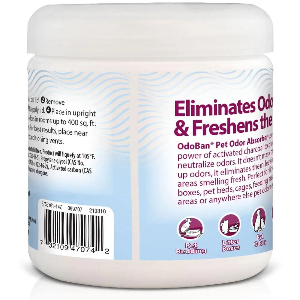 OdoBan Solid Odor Absorbers are designed to freshen and eliminate odors in areas prone to unpleasant smells, like bathrooms, closets, lockers, and litter boxes. The activated charcoal in the odor-absorbing gel traps unwanted airborne odors effectively. To use, simply twist off the lid, remove the protective seal, replace the lid, and place the absorber upright in the desired location. It works in rooms up to 400 sq. ft. for about 90 days. For optimal results, place near airflows like air conditioning vents. Follow label instructions for best use.