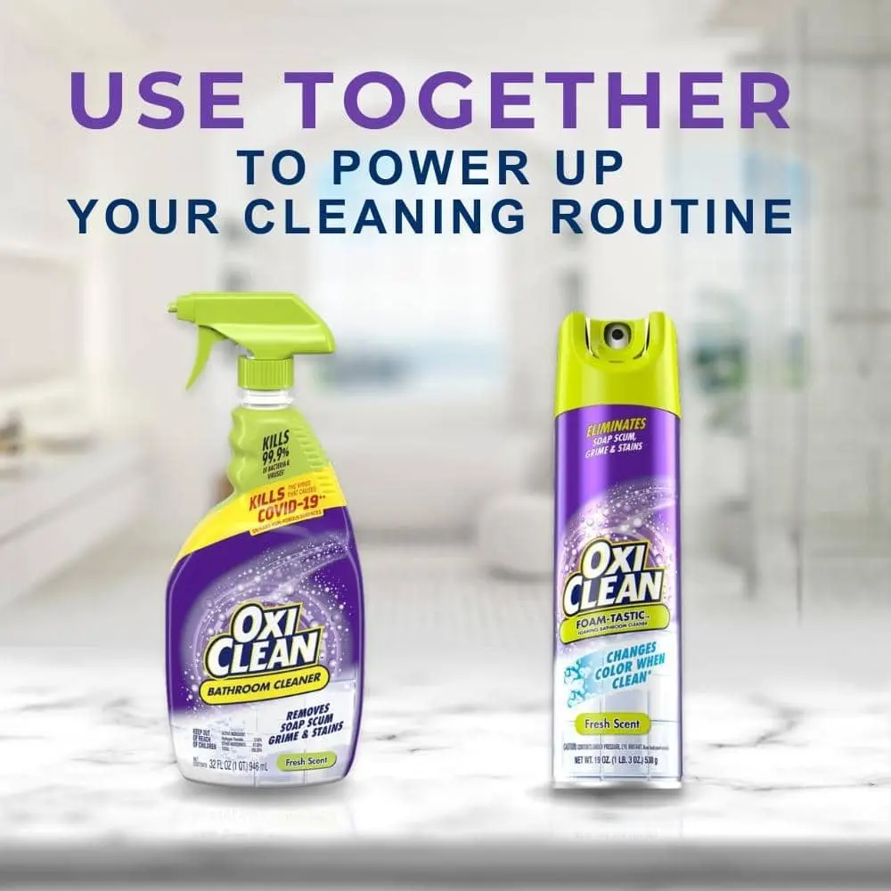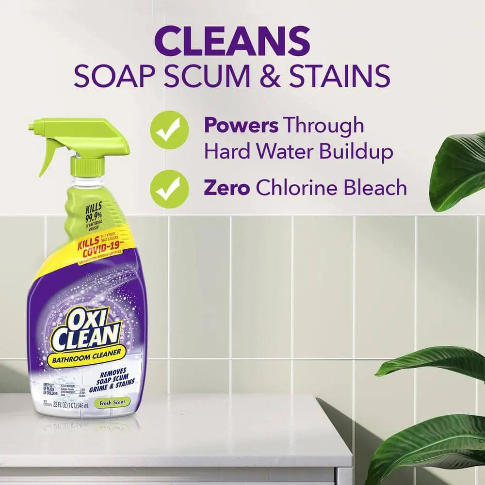Kaboom with the Power of OxiClean Stain Fighters Shower, Tub, and Tile Cleaner effectively removes grime, soap scum, calcium, and lime without the need for hard scrubbing. It’s bleach-free for a safer clean.