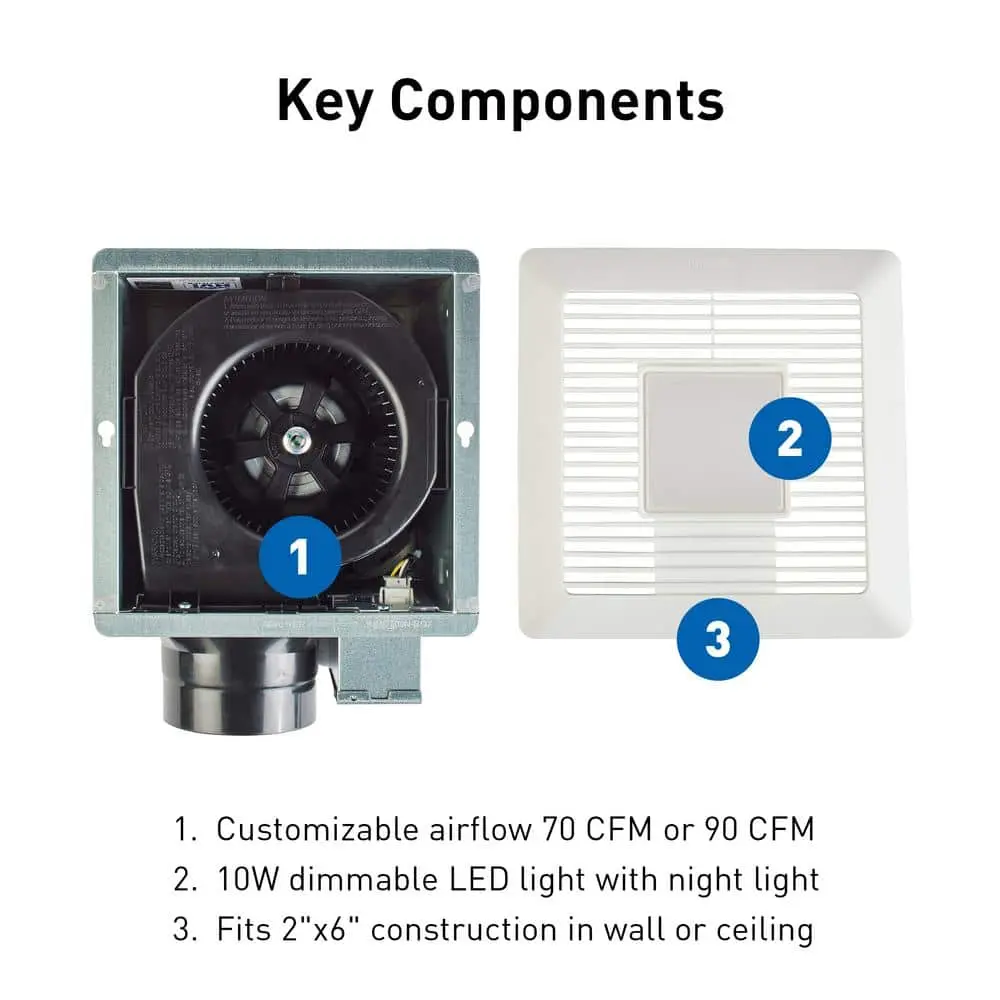 The Panasonic WhisperMighty RG-M79LA exhaust fan with LED lighting and optional nightlight (must be wired separately) is ENERGY STAR Certified. It features a Pick-A-Flow speed selector for two airflow options, ensuring optimal performance for your room size. This powerful, quiet, and energy-efficient fan is easy to install in ceilings or walls, making it ideal for small to medium rooms up to 90 sq. ft., such as bathrooms and laundry rooms. Improve your air quality by eliminating humidity, mold, and pollutants with this reliable ventilation solution!