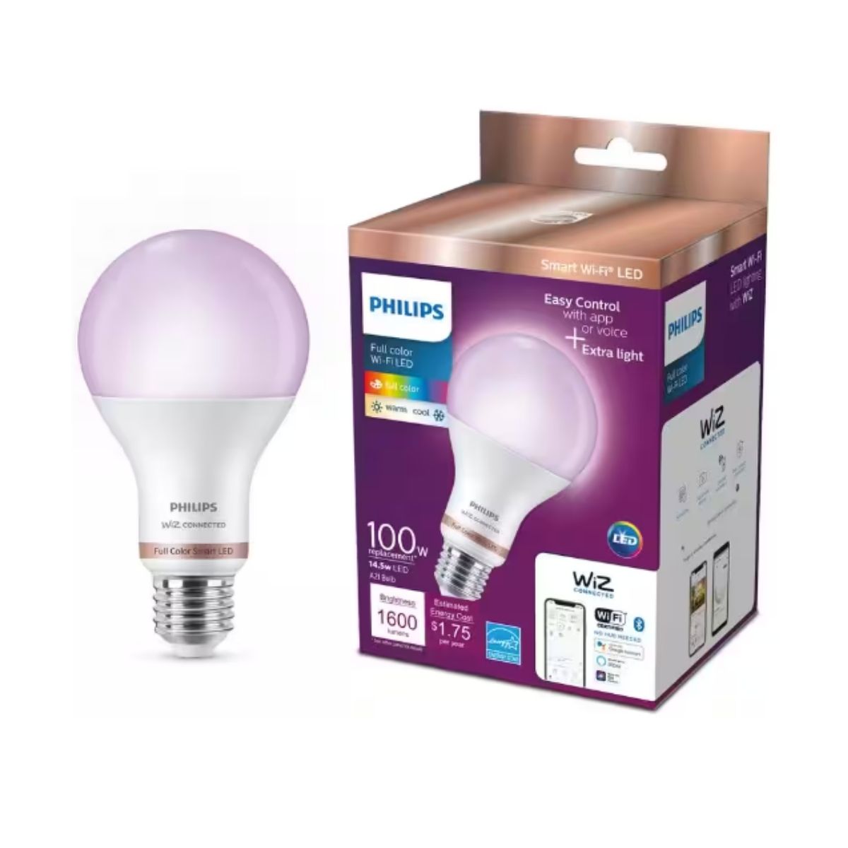 Philips Smart Wi-Fi LED lighting provides you with full authority over your lighting using smart bulbs that are user-friendly, practical, and cost-effective. We have enhanced all your beloved top-notch Philips bulbs to be smarter; simply connect them to your current Wi-Fi network. Philips Wi-Fi lighting is WiZ-connected and managed through the WiZ app. This intelligent Color and Tunable White 100-Watt equivalent A-shape bulb enables you to experience a vibrant and colorful life.